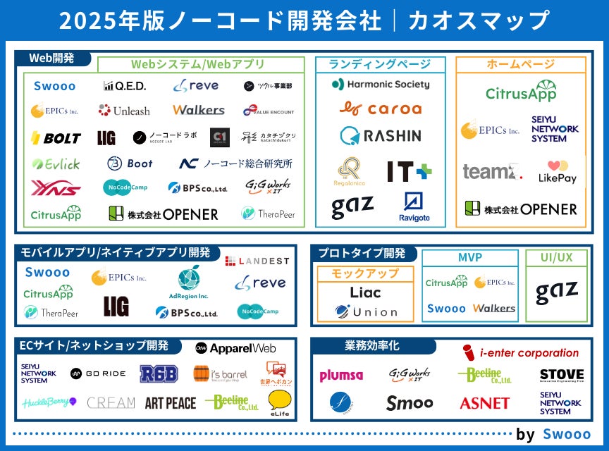 ノーコード受託開発事業を展開する合同会社ゼロイチスタート(本社:東京都中央区)は、「2025年度 ノーコード受託開発会社カオスマップ」を公開しました。