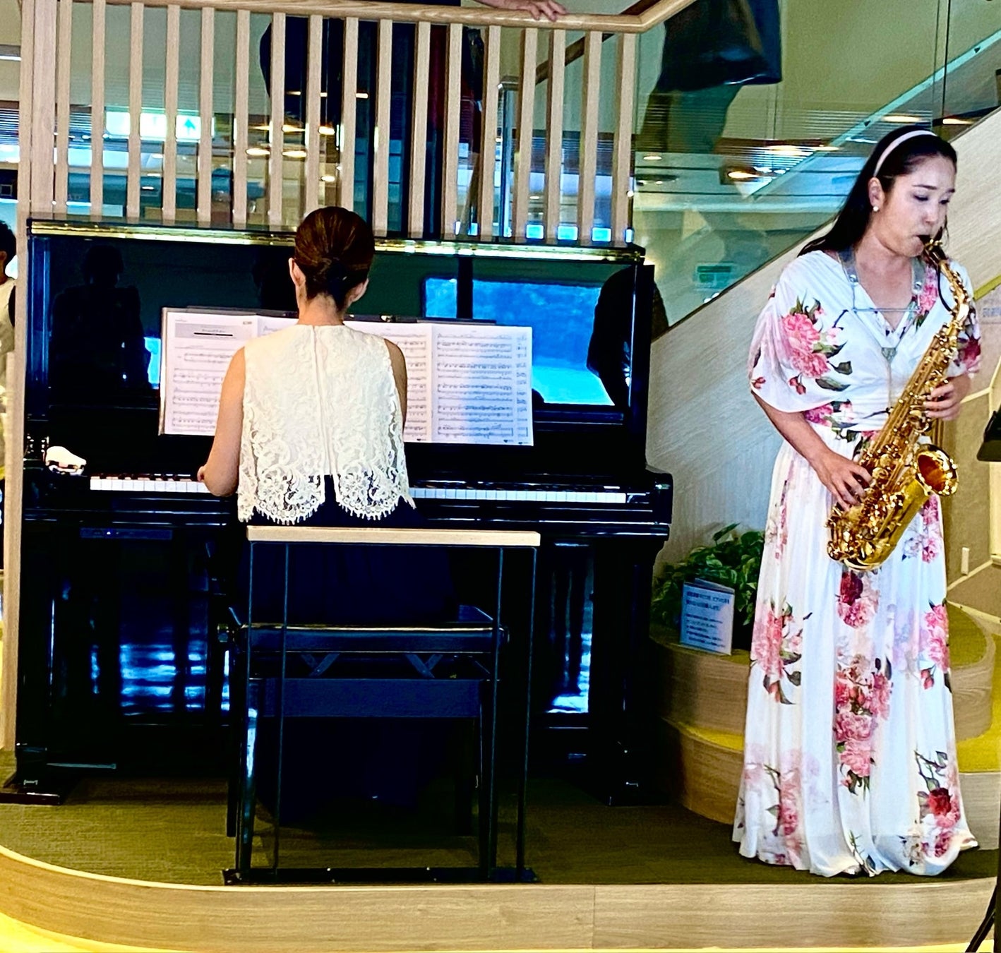 「棚田のステージ」に設置された「ふねピアノ」を岡部桂永子様が演奏し、バラードからポップソングまで、サックスとピアノの楽しいメロディで船内が包まれました。