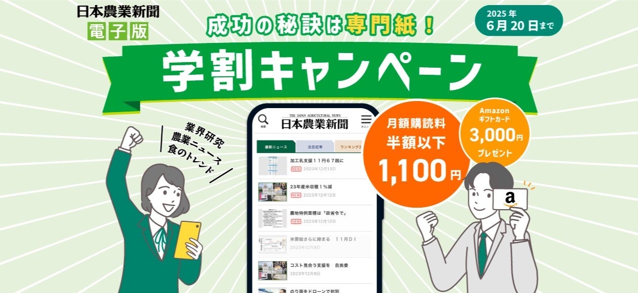 日本農業新聞(本社:東京都台東区、代表取締役社長:田宮和史郎)は、学生・生徒の皆さんを対象に、「日本農業新聞電子版」を月額1,100円(通常価格2,403円)で購読できるキャンペーンを11月から始めました。ぜひこの機会に、日本農業新聞電子版をお得にご活用ください。