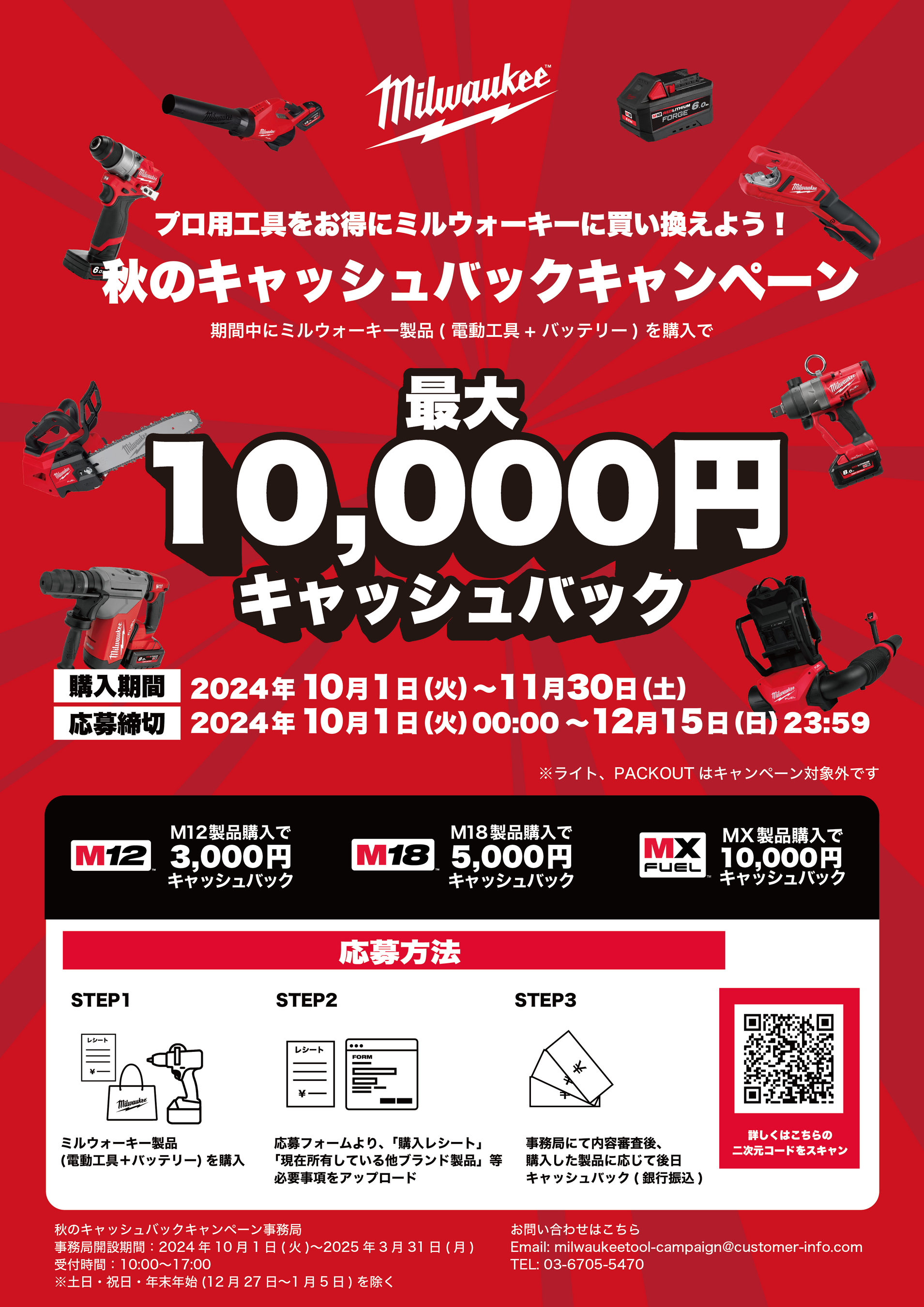 ミルウォーキーツール・ジャパン合同会社(本社:東京都板橋区、ゼネラルマネージャー:林琢磨)は、10月1日(火)~11月30日(土)の期間中、電動工具とバッテリーを同時にご購入いただくと、最大10,000円をキャッシュバック(※)する「秋のキャッシュバックキャンペーン」を実施いたします。