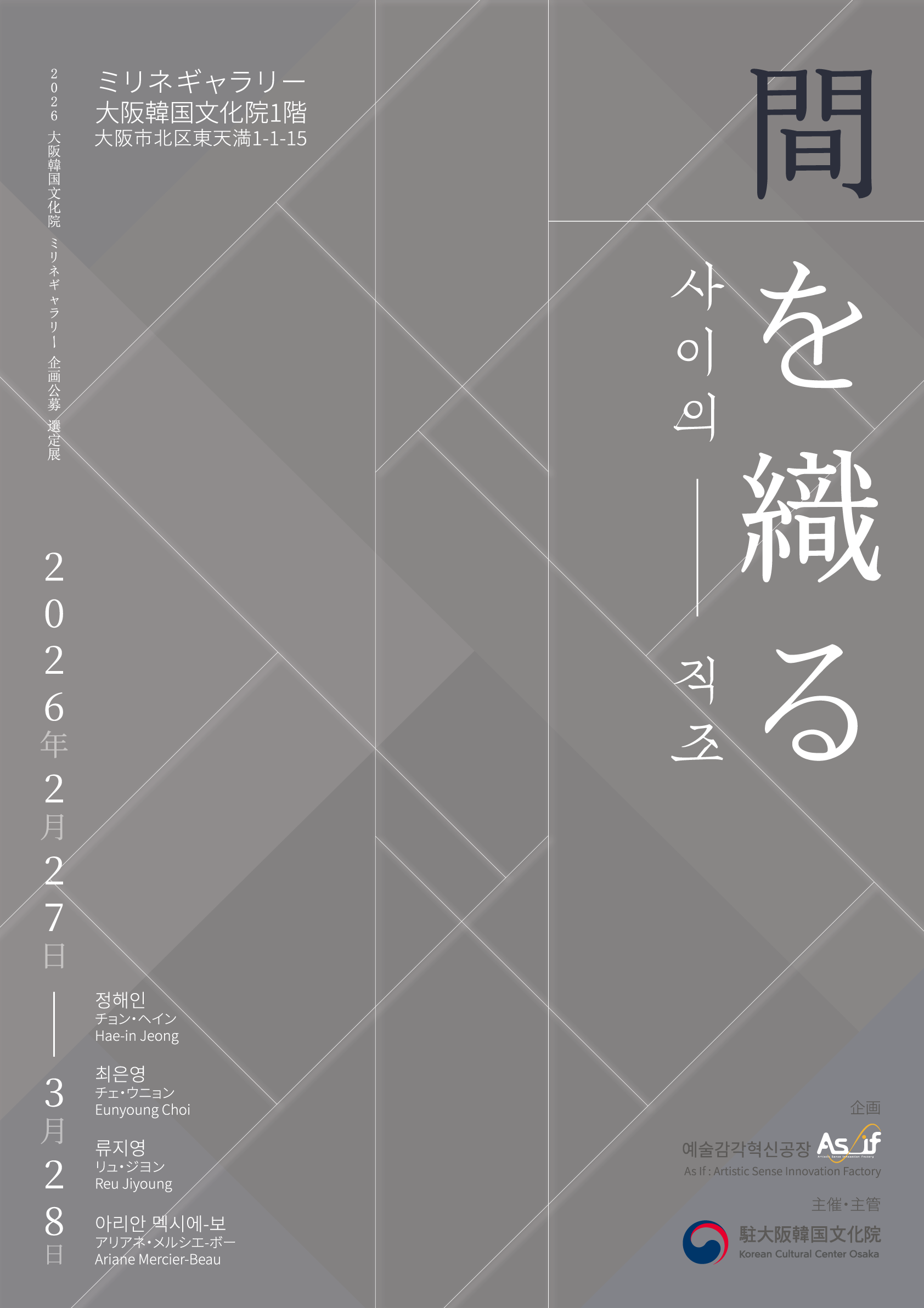 大阪韓国文化院(院長 キム・ヘス、大阪市北区東天満1-1-15)は、2月27日(金)から3月28日(土)まで、本院1階のミリネギャラリーにて<間を織る>展を開催します。
