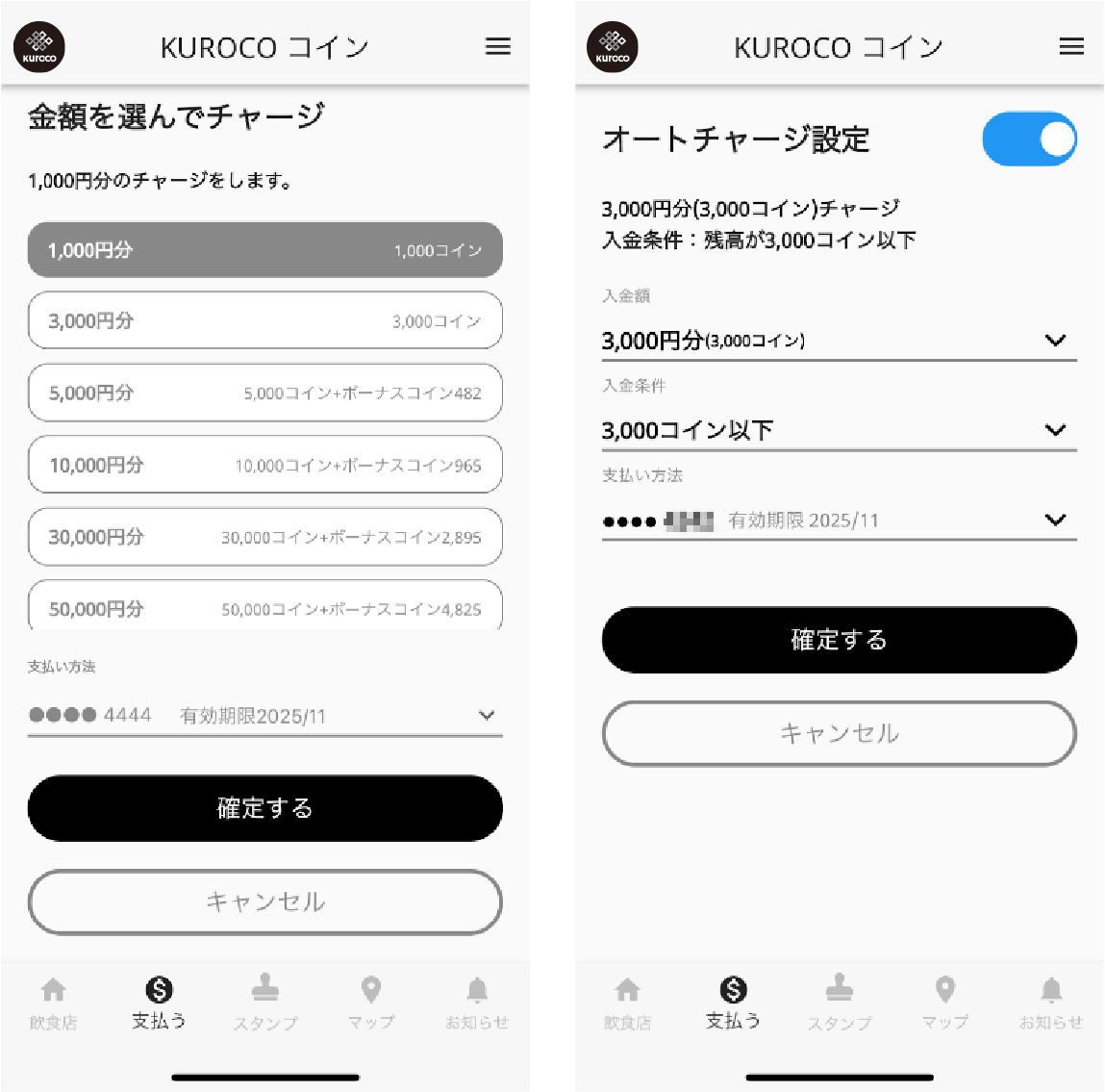 今回リリースした「KUROCOコイン」は、アプリ内で購入していただいたKUROCOコインをクロコ社の飲食店で決済に使用できるというもの。5000円以上の購入でボーナスコインが付与されます。