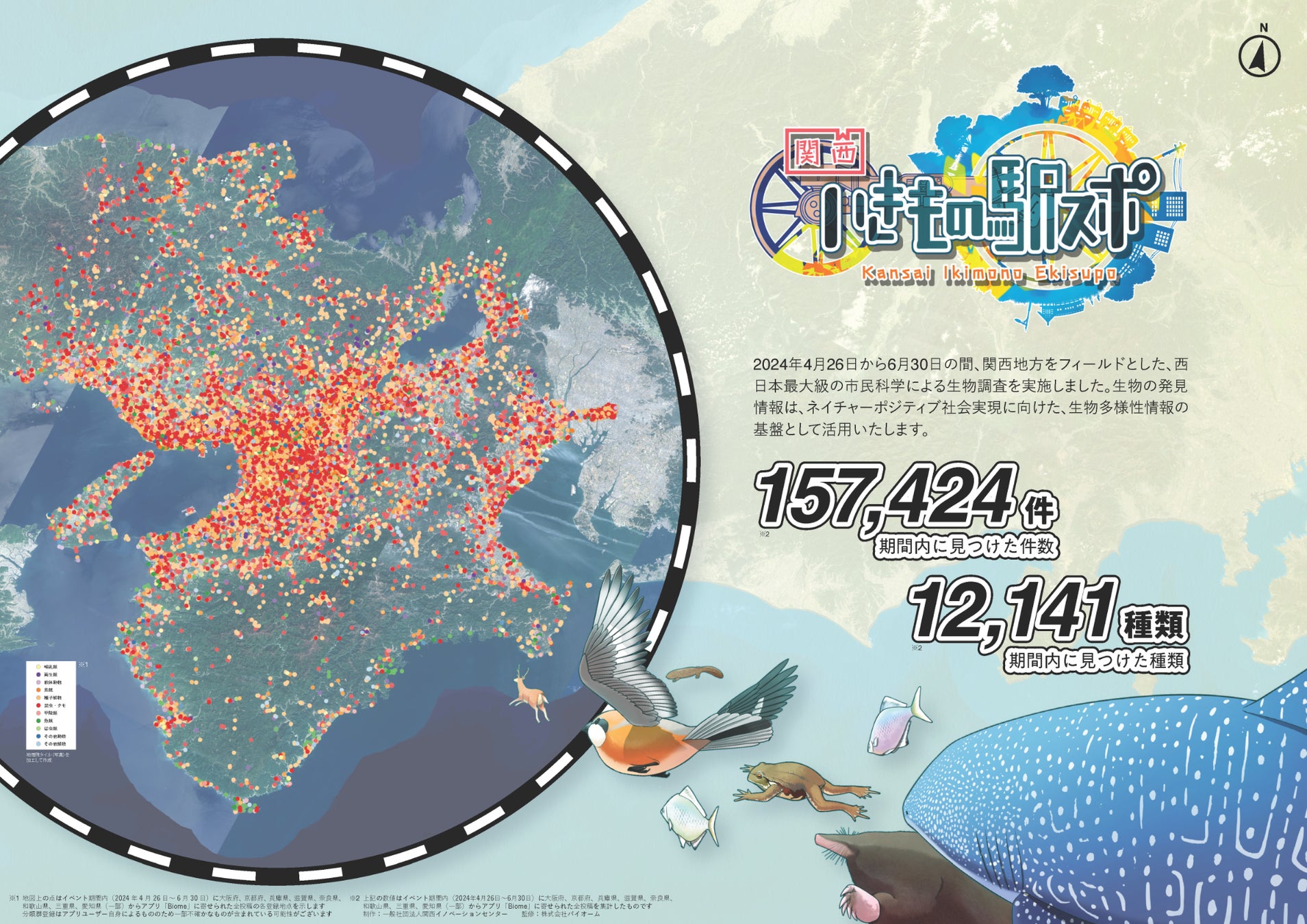 一般社団法人関西イノベーションセンター(理事長 早乙女 実(そうとめ みのる))と、株式会社バイオーム(代表取締役 藤木 庄五郎(ふじき しょうごろう))は、関西一円を対象とするネイチャーポジティブ※1イベント「関西いきもの駅スポ」※2を2024年4月26日から6月30日の間実施しました。当期間中、いきものコレクションアプリ「Biome(バイオーム)」を通じて、関西で発見した動植物の写真を投稿していただくよう一般市民へ広く呼びかけた結果、約2か月間で157,424件(12,141種)もの生物発見データを収集することができました。