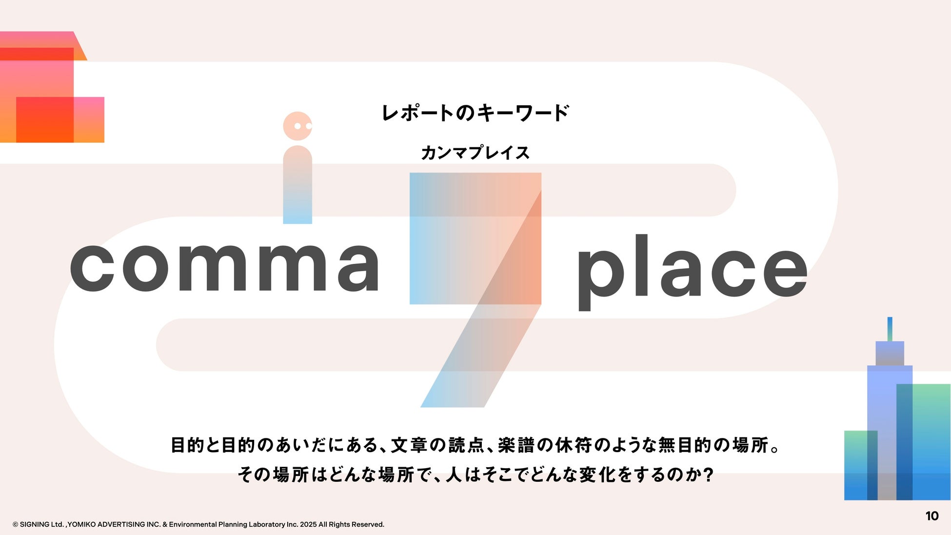 コロナ禍を経て、人々の日常は以前の日常に戻ったわけではなく、DXが生活に馴染み、オンオフ問わず「目的のある行動」「効率的な活動」が重視され、何でもない時間の価値に光を当てにくい生活となりました。そんな現代において、「なにげない」時間をウェルビーイングに過ごすためのヒントとなる「なんだかついつい居たくなる場所」を「”comma place(カンマプレイス)"=目的と目的の間の、文章の読点・楽譜の休符のような無目的の場所」と定義し、その在り方について探ります。