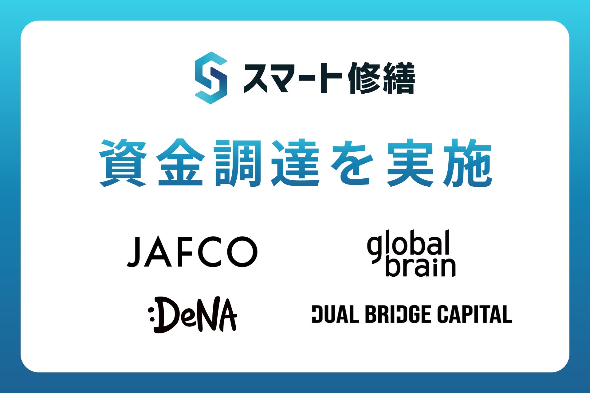 マンションやビルなど大型建物の修繕工事の見積、工事支援サービスを展開する株式会社スマート修繕(本社:東京都港区、以下「当社」)は、日本最大の累計投資社数を誇るベンチャーキャピタル JAFCOが運用するファンド、東日本旅客鉄道株式会社を主な出資者とするグローバル・ブレインが運用する「高輪地球益ファンド」、ミダスキャピタルGr.のDual Bridge Capitalが運用するファンド、そしてディー・エヌ・エー(DeNA)より資金調達を実施しました。
