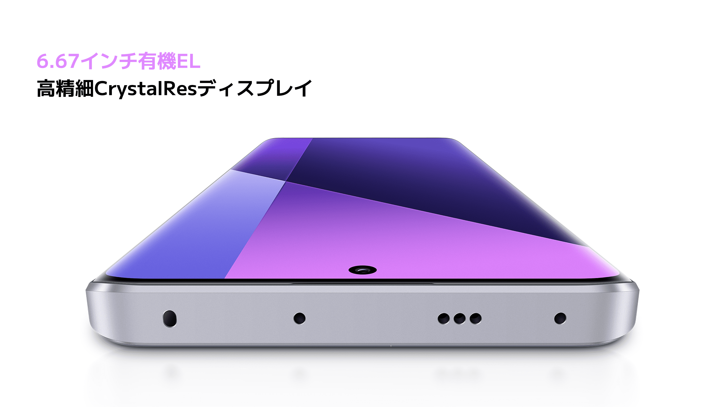 1.5K(2,712×1,220)解像度で「CrystalRes」技術を搭載した約6.67インチ有機EL(AMOLED)のディスプレイは12ビットの色深度と1,800nitの最大輝度ではどんな環境でも鮮やかなディスプレイ表示を実現、さらに120Hz LTPOリフレッシュレートと2,160Hzのタッチサンプリングレートでは、ウェブ閲覧やゲーム時の体験において、なめらかで機敏な操作感を提供します。