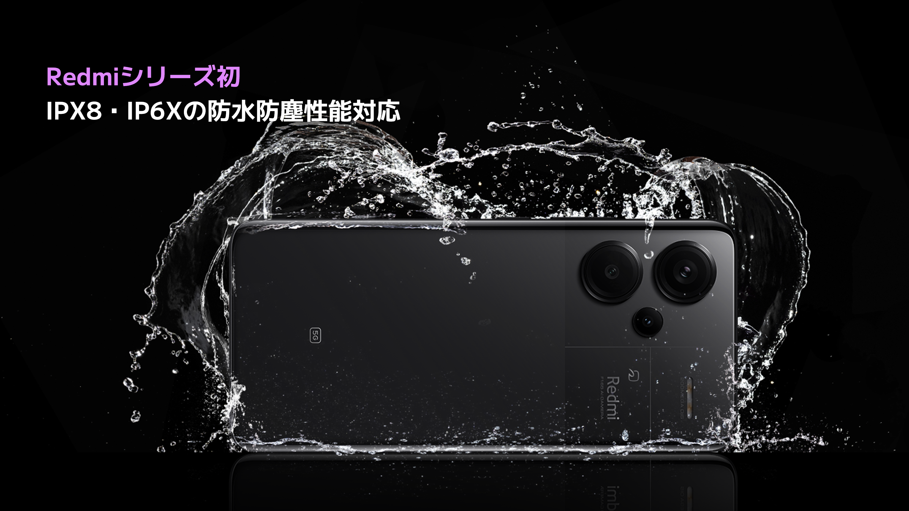 Redmi Note 13 Pro+ 5GはRedmi Noteシリーズとしては初めてのIPX8・IP6Xの防水防塵性能に対応した機種です。急なゲリラ豪雨はもちろん、うっかりと水にスマートフォンを落としてしまっても問題ありません。