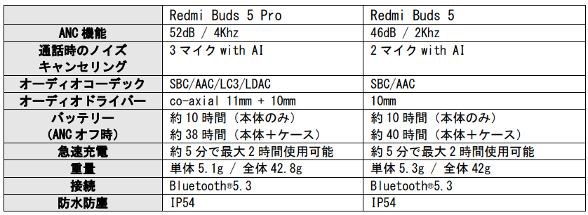Xiaomi公式サイト(mi.com):https://www.mi.com/jp/product/redmi-buds-5/