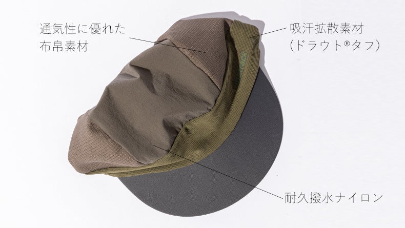 ウエアと同じ「ドライレイヤリング」のメカニズムを搭載。汗のベタつきや濡れを抑えるため、頭囲をぐるっと一周「ドライレイヤー」素材で当て布し、その表側にベースレイヤー素材「ドラウトタフ」を配置。肌をドライに保ち、スピーディに吸汗拡散します。