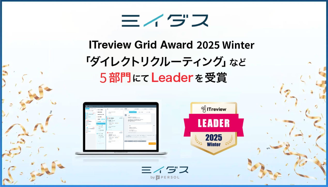 「はたらいて、笑おう。」をビジョンに掲げるパーソルグループの中途採用サービス『ミイダス』を運営するミイダス株式会社(本社:東京都港区、代表取締役社長:後藤 喜悦)は、アイティクラウド株式会社(本社:東京都港区、代表取締役社長兼CEO 黒野源太)が主催する「ITreview Grid Award 2025 Winter」にて、5部門で最高位の「Leader」を受賞しました。「ダイレクトリクルーティングサービス」「適性検査サービス」「エンゲージメントサーベイツール」の3部門では「ITreview Grid Award 2023 Spring」から続いて8期連続の受賞、その他「離職防止ツール」「タレントマネジメントシステム」で受賞しました。