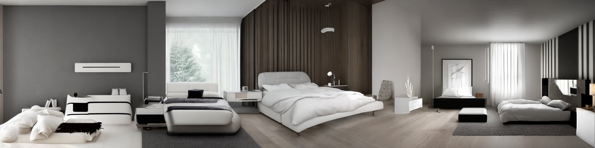 - パノラマ画像:白とグレーを基調としたモダンな寝室の360度画像