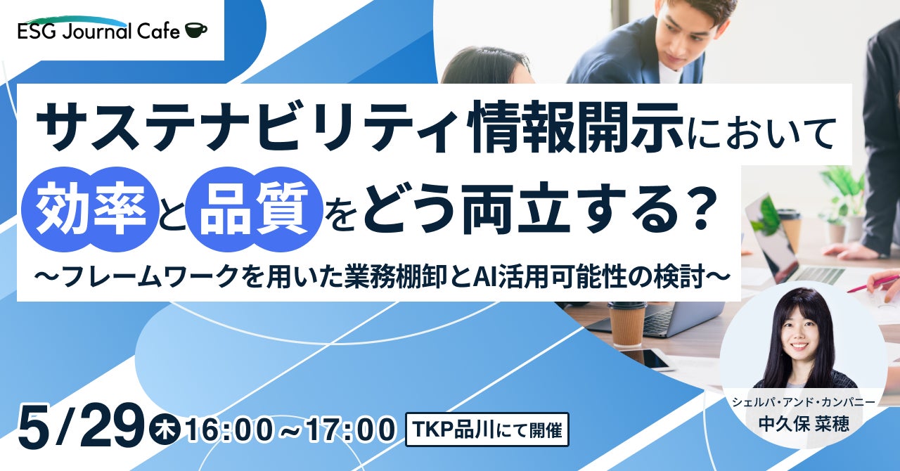 シェルパ・アンド・カンパニー株式会社(本社:東京都品川区、代表取締役CEO 杉本淳、以下シェルパ)が運営するESG・サステナビリティ特化型メディア「ESG Journal Japan」(以下ESG Journal)は、無料購読会員限定の特別イベント「ESG Journal Cafe」(以下本イベント)を2025年5月29日に実施します。