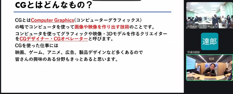 授業は、将来コンテンツ業界を目指す生徒たちの視点に立ち、CGの概念やCGデザイナーの仕事、そして最新の制作環境について具体的に紹介されました。