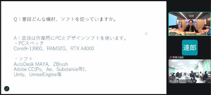 「CGとはどんなものか?」から、「2DCGと3DCGの違い」、そしてCGデザイナーの仕事内容といった業界の基礎知識を解説。天草工業高校CG系列で実際に学んでいる内容や制作環境(使用PCやソフト)も紹介し、生徒へのインタビューも交えながら、学びのリアルな側面を伝えました。