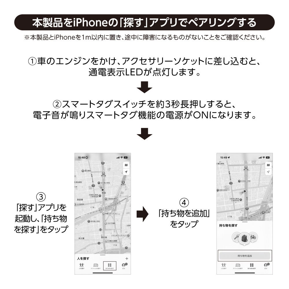 本製品は、車載用USB充電器としての実用性と、車両位置を確認できるスマートタグ機能を1台に集約。