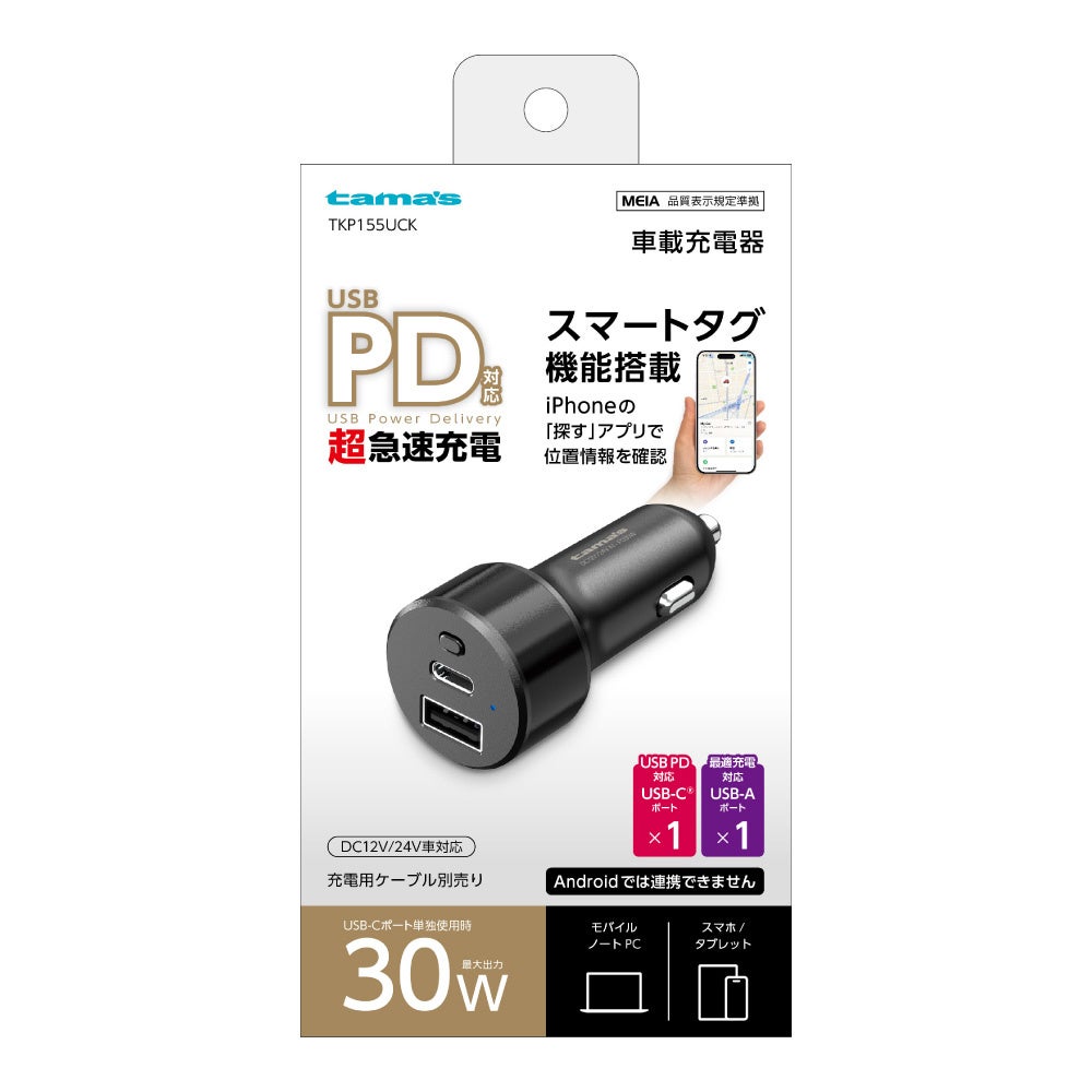 多摩電子工業株式会社(本社:神奈川県川崎市、代表取締役 執行役員社長:杉山 一)は、iPhoneの標準アプリ「探す」に対応したスマートタグ機能を搭載した**「スマートタグ機能付カーチャージャー C+A(型番:TKP155UCK)」**を発売いたします。