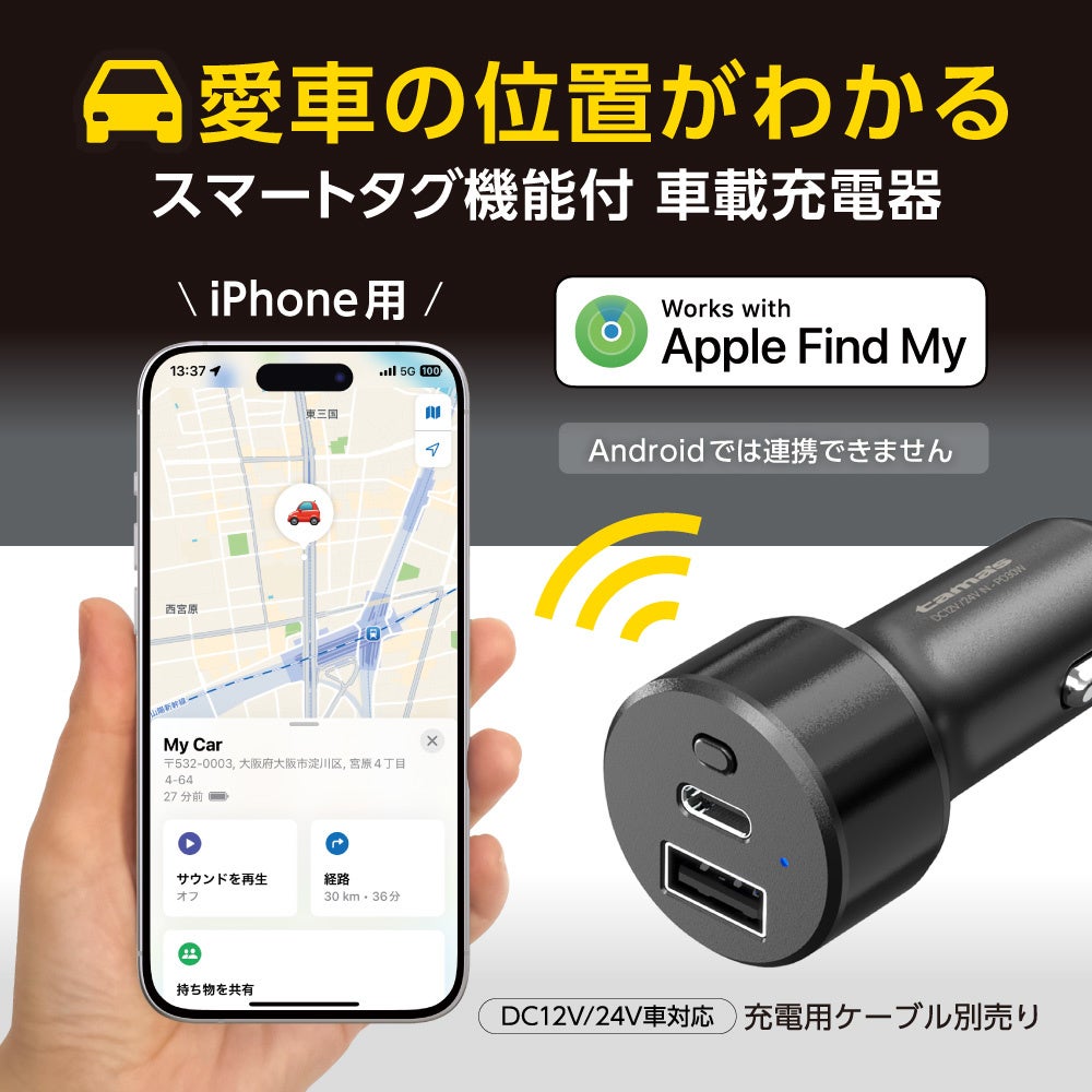 車の“置き場所がわからない”悩みを解決 iPhoneの「探す」に対応したスマートタグ機能付カーチャージャー登場