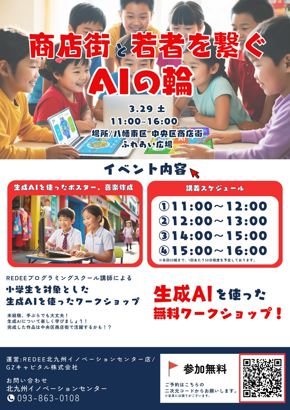 この度「北九州イノベーションセンター」を運営するGZキャピタル株式会社(本社:福岡県北九州市、社長執行役員:大屋 喬史)は、令和7年3月29日(土)に開催する「東田・未来都市フェスタ」の運営に携わります。開催に先立ちまして、生成AI体験イベント「商店街と若者を繋ぐAIの輪」の参加者(小学生と、その保護者)を募集します。