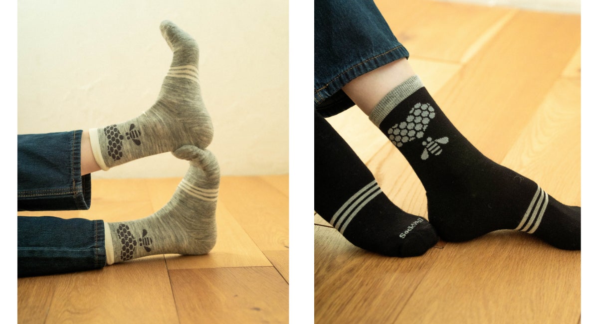 幸運の象徴ともいわれるミツバチモチーフ。ハートにかたどられたハチの巣が可愛らしさをプラスしています。締め付けない履き口と縫い目がないストレスフリーな指先の仕様で、履き心地にこだわったリラックスしてご着用いただけるデイリーソックスです。