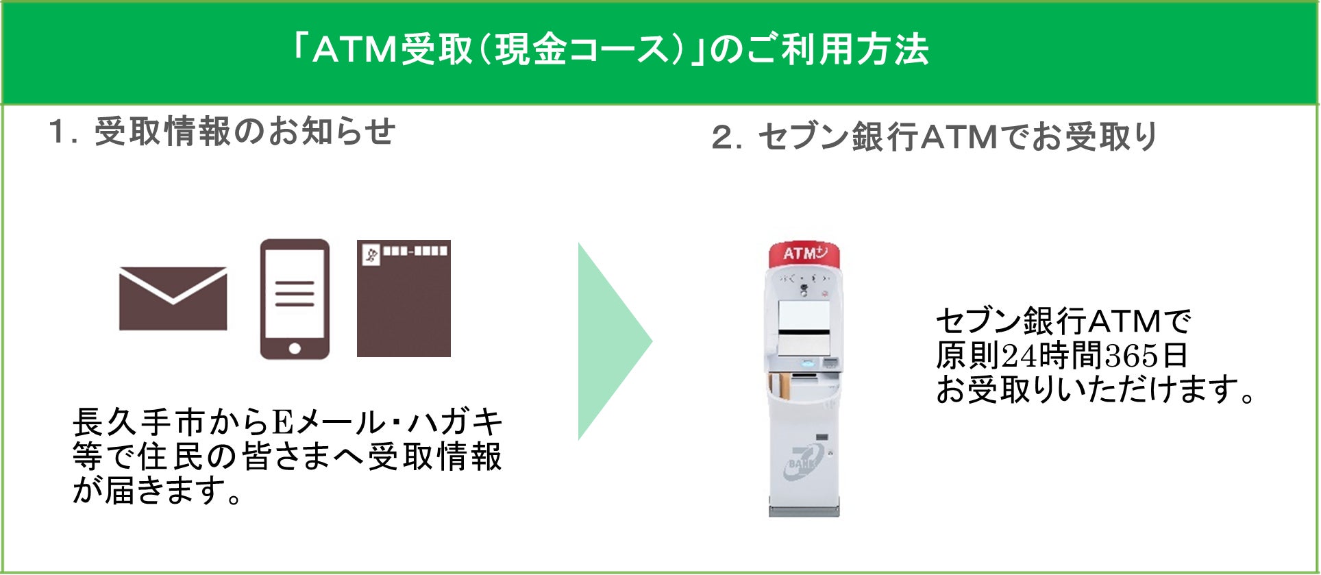 株式会社セブン銀行グループの株式会社セブン・ペイメントサービス(本社:東京都千代田区、代表取締役社長:柏熊 俊克)は、愛知県長久手市(市長:佐藤 有美、以下長久手市)へ「ATM受取(現金コース)」の提供を2026年3月2日(月)より開始しました。