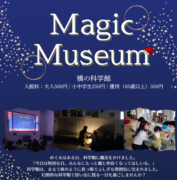 明石海峡大橋の架橋技術をぎゅっと詰め込んだ「橋の科学館」にて、12月14日(土)にクリスマスイベントを開催します。昼なのに真っ暗な館内をランタンを持って巡ったり、ワークショップを行ったり、家族みんなでお楽しみいただけるイベントです。是非お越しください。