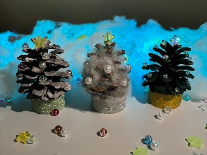 松ぼっくりを使って、絵の具やビーズ、綿などで自由にデコレーションし、自分だけのクリスマスツリーオーナメントを作ろう。
