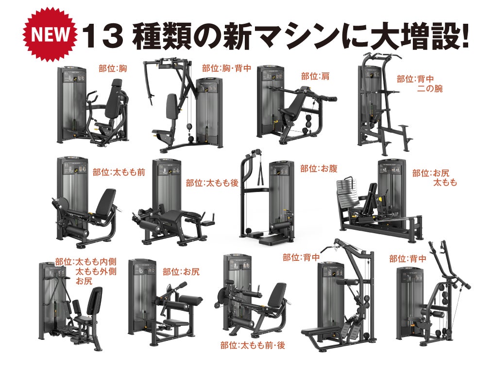 さらに、24時間365日利用可能な設備を整え、仕事や家事で忙しい方々が自分のペースでトレーニングを行える環境を提供します。施設内には13種類のオリジナルマシンを新規導入し、多様なニーズに応えるトレーニングが可能です。