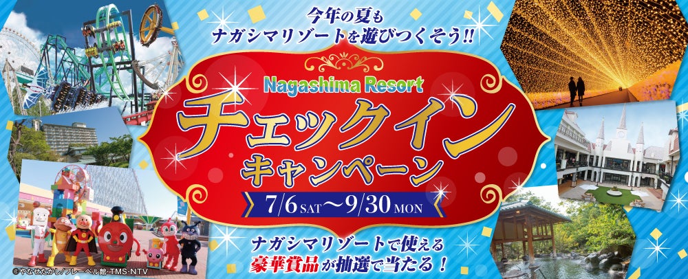 対象施設は、ナガシマスパーランド、なばなの里、長島温泉湯あみの島、名古屋アンパンマンこどもミュージアム&パーク、ホテル花水木、ガーデンホテルオリーブ、ホテルナガシマの7施設。入口付近にあるポスターのQRコードを読み込んでスタンプを入手できます。抽選のチャンスは、チェックインスタンプ1個で1回、スタンプ2個以上で2回にアップ。この夏、ナガシマリゾートに訪れたら、チェックインスタンプをゲットして存分に遊びつくそう!