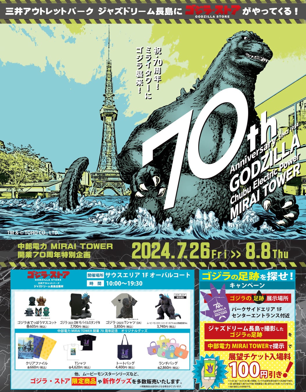 「ゴジラ・ストア 三井アウトレットパーク ジャズドリーム⻑島出張所」が期間限定でオープンします。ゴジラ・ストア限定商品や、新作グッズ、「中部電⼒ MIRAI TOWER にゴジラ襲来!」オリジナルグッズもお買い求めいただけます。