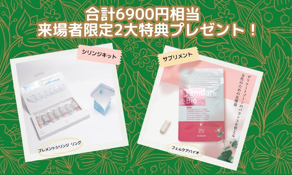 ご来場者様限定で、株式会社オンリースタイルのシリンジキット「プレメントシリンジ リング」(1500円相当)と、株式会社nurse cureのサプリメント「フェムケアバイオ」(5400円相当)を全員にプレゼント致します!是非、ご自身の妊活にお役立てください。