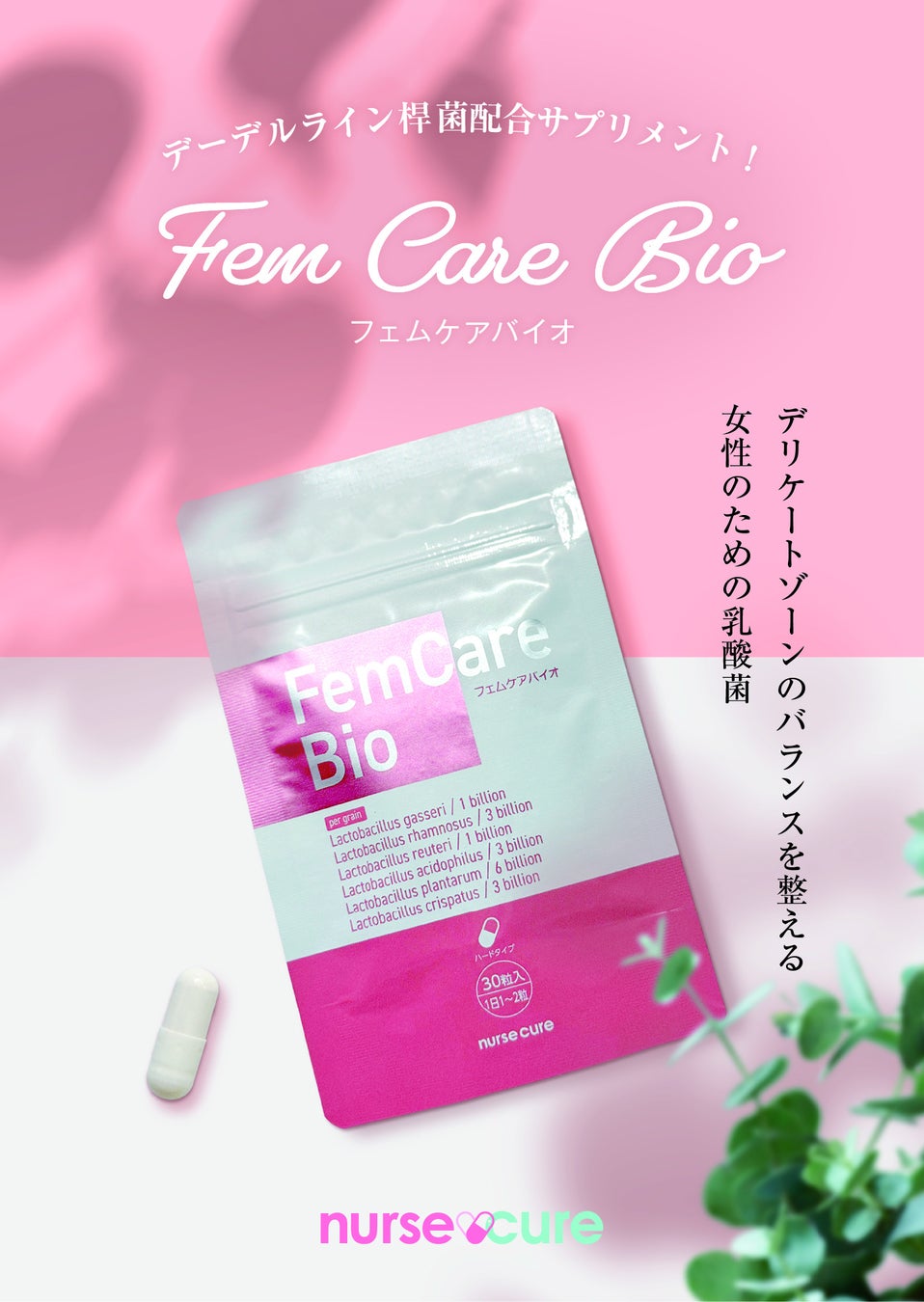 株式会社ナースキュアの「Fem Care Bio」は、デリケートゾーンをサポートするデーデルライン桿菌サプリメントです。開発者自らが20年に渡り延べ1万5千人の患者の症例を診てケアした経験から、腸内細菌に着目、開発しヒット商品となった菌活サプリメント「シンバイオティクスEX」(2021年~販売中)に次ぐ待望の第二弾として発売されたサプリメントです。