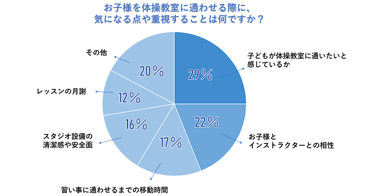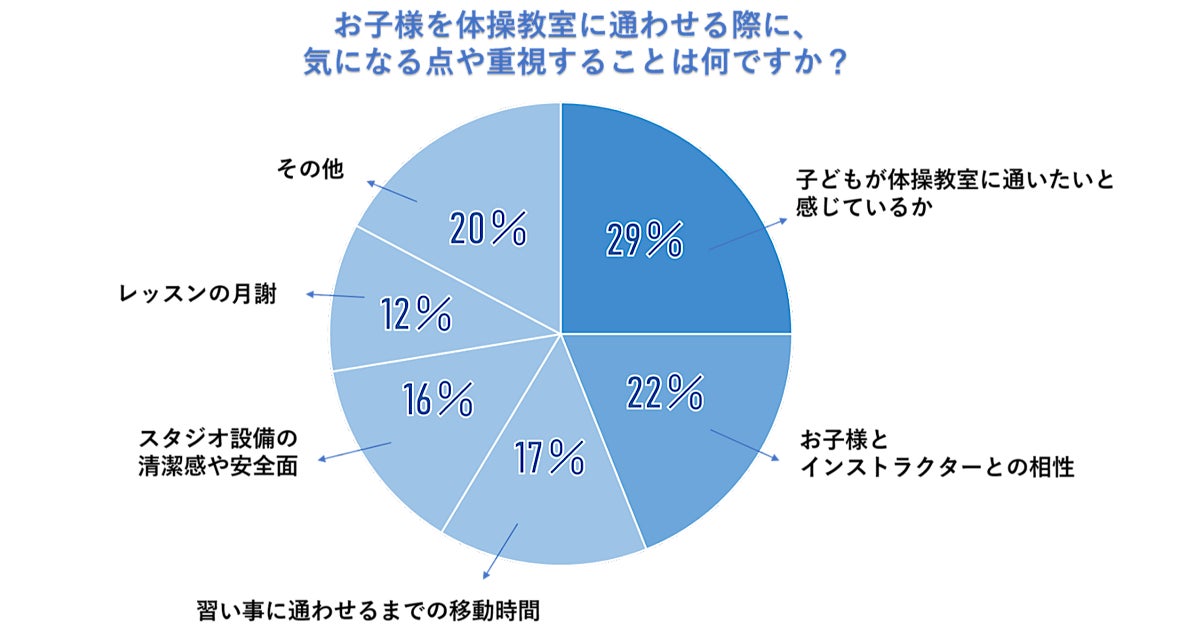親御さまがお子さまを教室に通わせる際に、「子どもが体操教室に通いたいと感じているか」や「お子様とインストラクターとの相性」という点を気にする声が多い結果に。