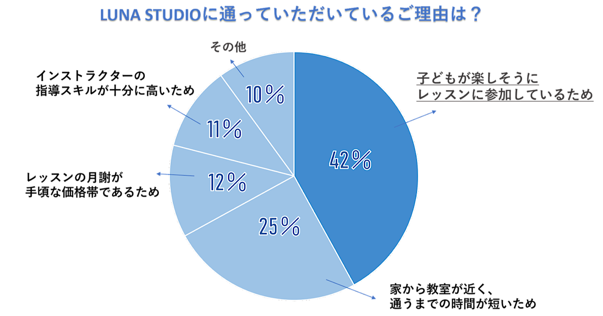 嬉しい子ことに、LUNA STUDIOに通っている理由では、「子どもが楽しそうにレッスンに参加しているため」という声が多い結果に!