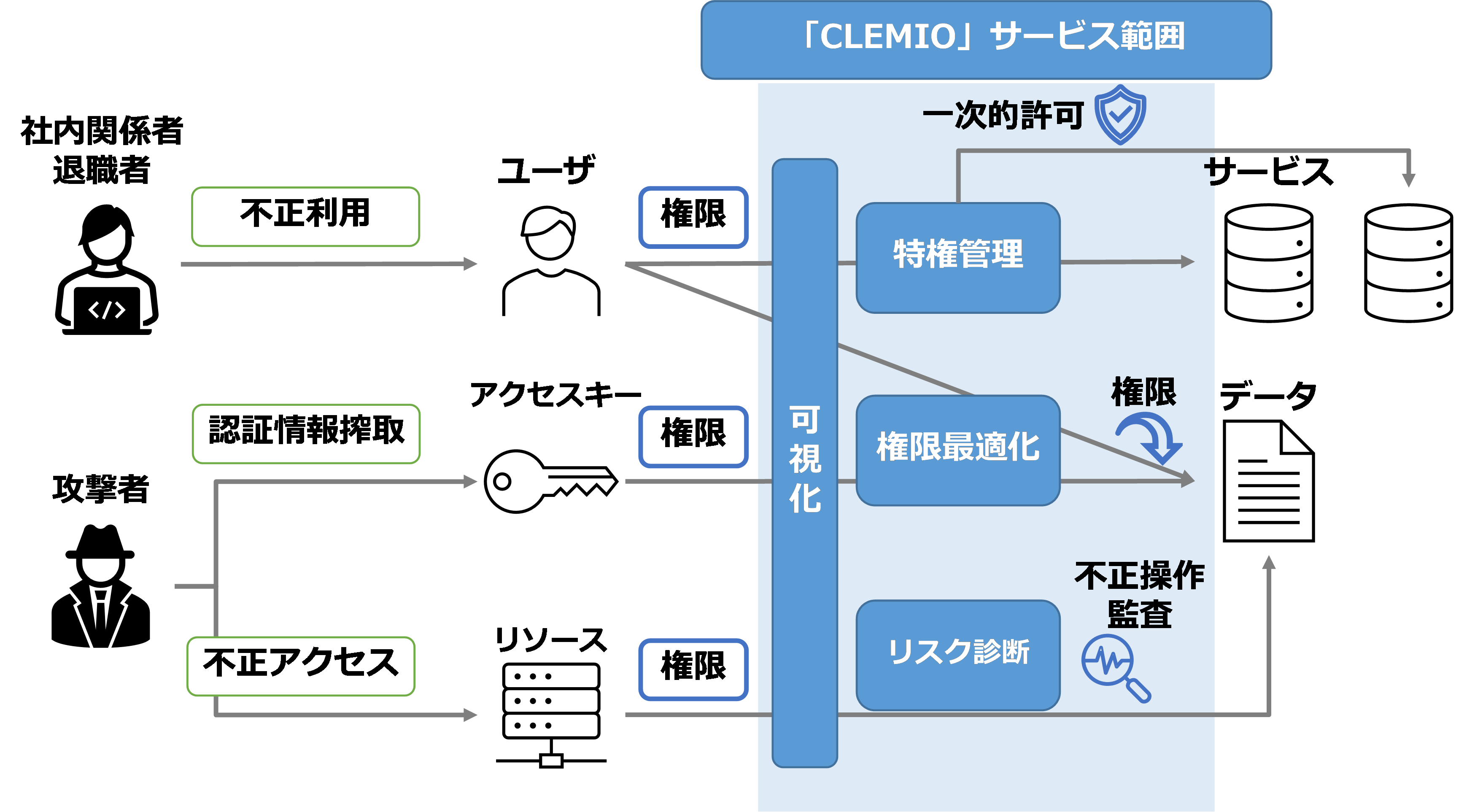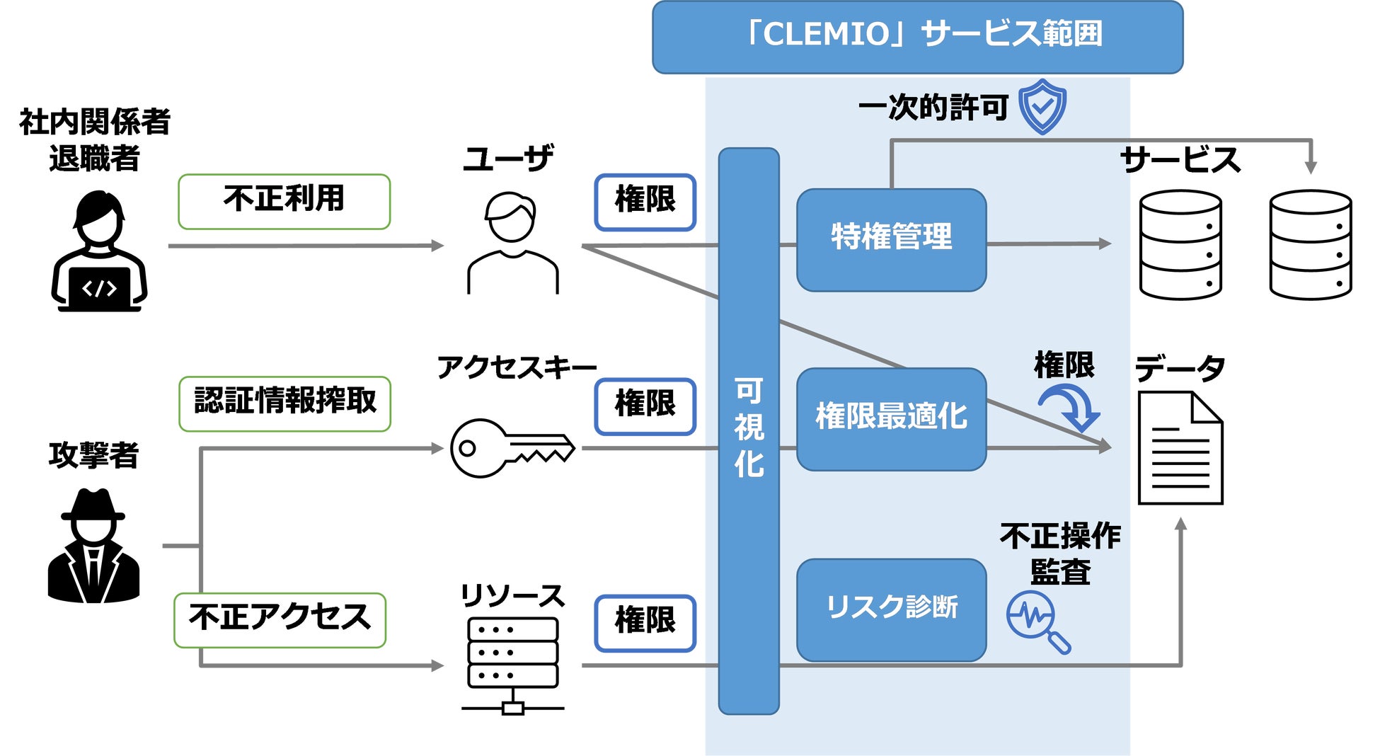 CLEMIOは、クラウドサービスのアクセス権限を適切に管理し、想定外のアクセスからの内部不正を防ぐソリューションです。まずは、 AWS向けの機能を提供し、今後は、その他のクラウドサービスやマルチクラウド環境に向けて機能拡充していく予定です。
