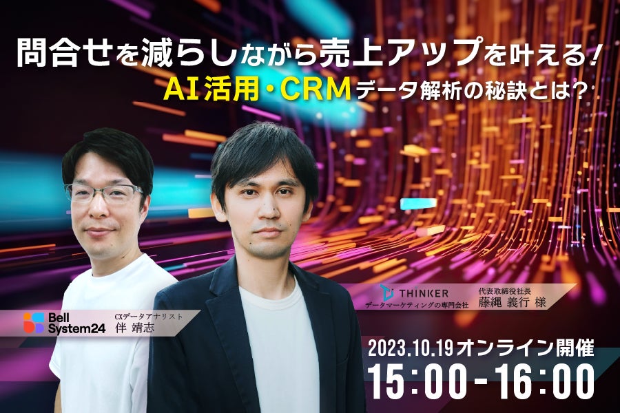 株式会社ベルシステム24(本社:東京都港区、代表取締役 社長執行役員:野田 俊介、以下:当社)は、グループ会社であるデータマーケティング事業やAIソリューション開発を手掛ける株式会社シンカー(本社:東京都千代田区、代表取締役社長:藤縄 義行、以下:シンカー社)が登壇する、「呼減と売上アップを叶える!AI活用・CRMデータ解析の秘訣とは?」と題したオンラインセミナー(以下:本セミナー)を、10月19日(木)に開催します。