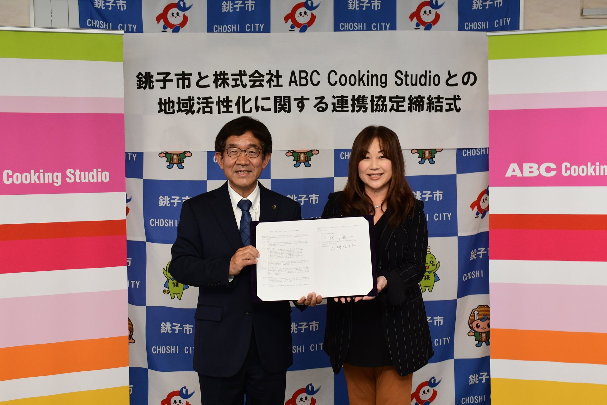 銚子市とABCクッキングスタジオの連携協定締結式を5月27日(火)に執行いたしました。当日は、銚子市 の越川 信一市長および、株式会社ABC Cooking Studio代表取締役社長 兼 CEO の志村なるみが出席し、連携協定書の取り交わしを行いました。