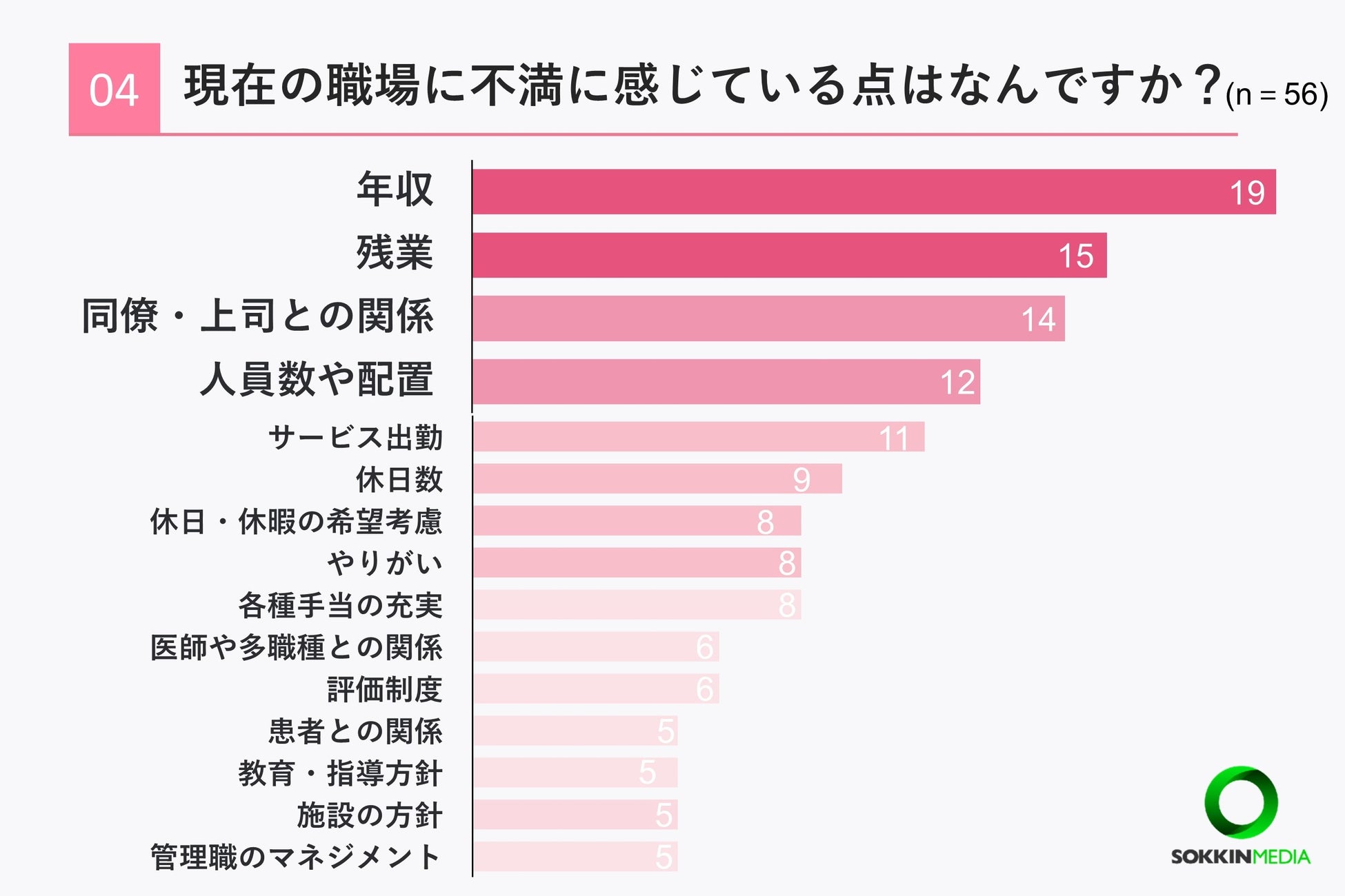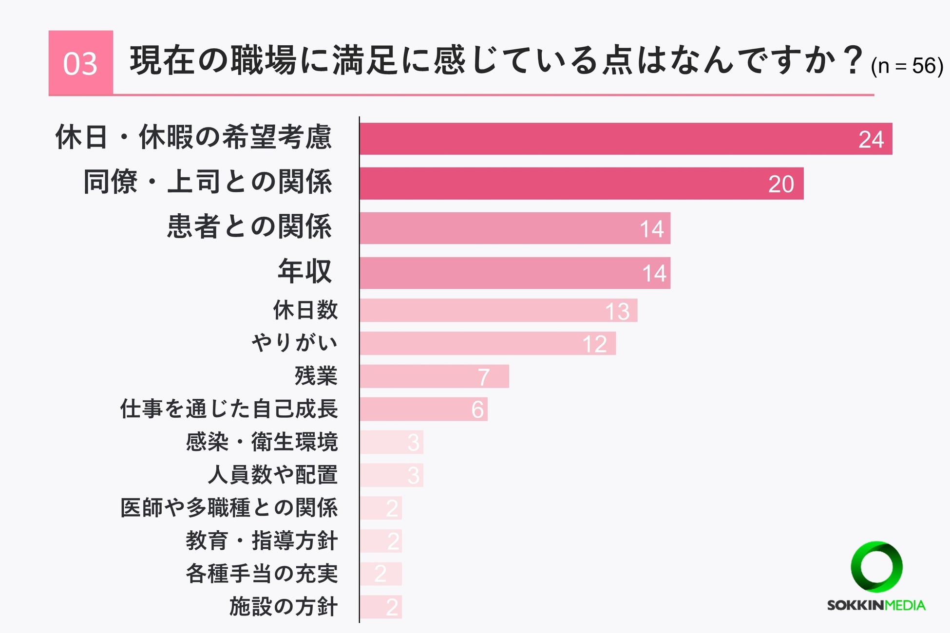 「Q3. 職場に満足に感じている点はなんですか? 」という問いに対して「休日・休暇の希望考慮」と回答した方が最も多く24票に上りました。次いで「同僚・上司との関係」という回答が20票「患者との関係」という回答が14票という結果になりました。