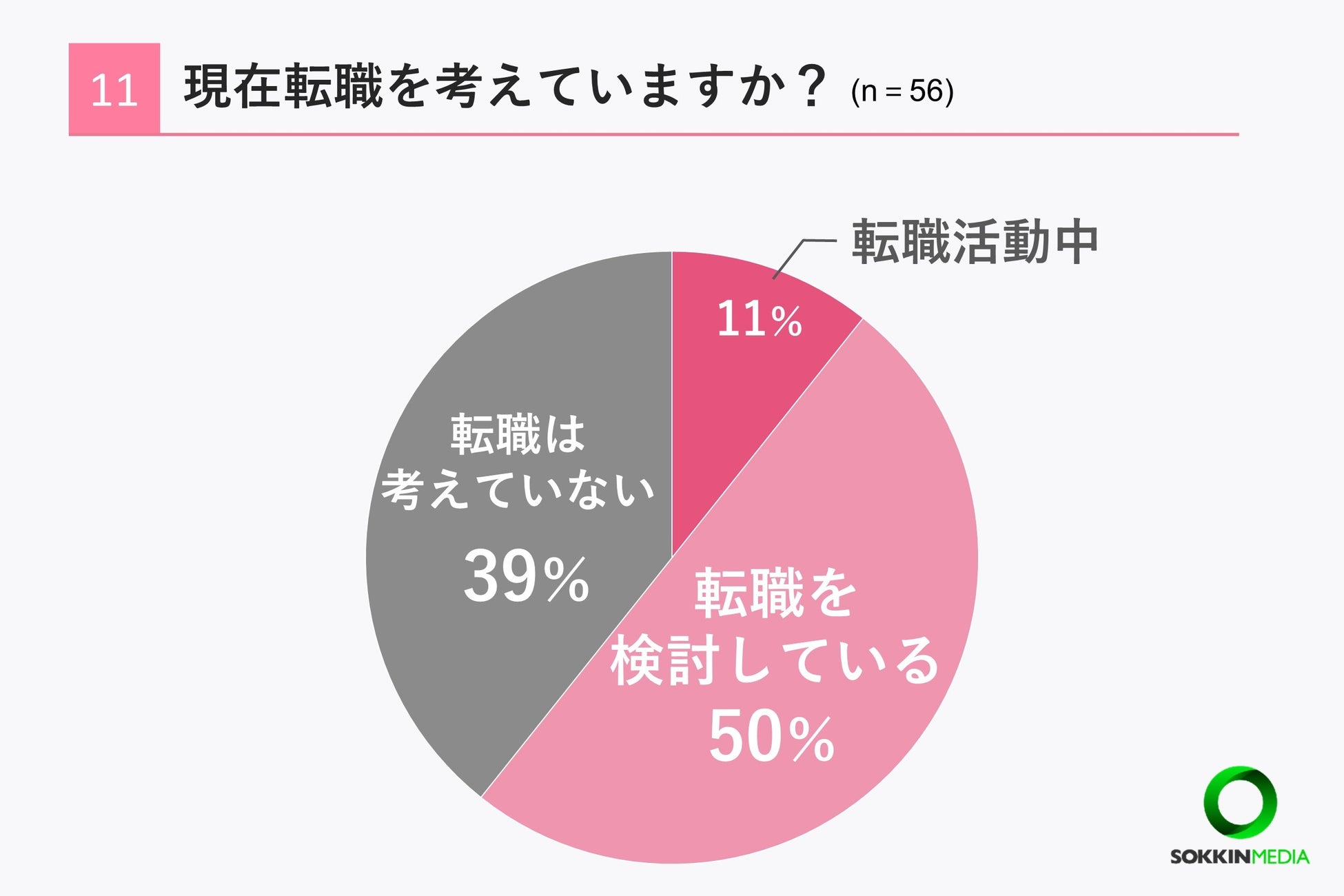 「Q11. 現在転職を考えていますか?」という問いに対して、「転職を検討している」という回答が最も多く50%という結果になりました。転職活動中も合わせると、全体の61%が転職を考えているいうことがわかりました。