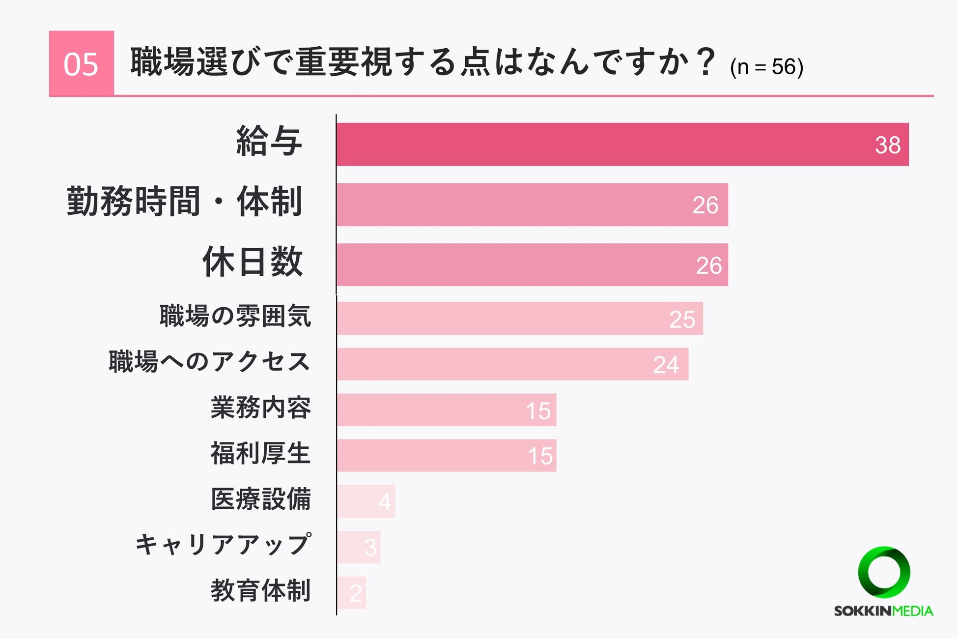 「Q5. 職場選びで重要視する点はなんですか?」という問いに対して、「給与」という回答が38票で最も多いという結果になりました。次いで「勤務時間・体制」「休日数」という回答が同票で26票となりました。