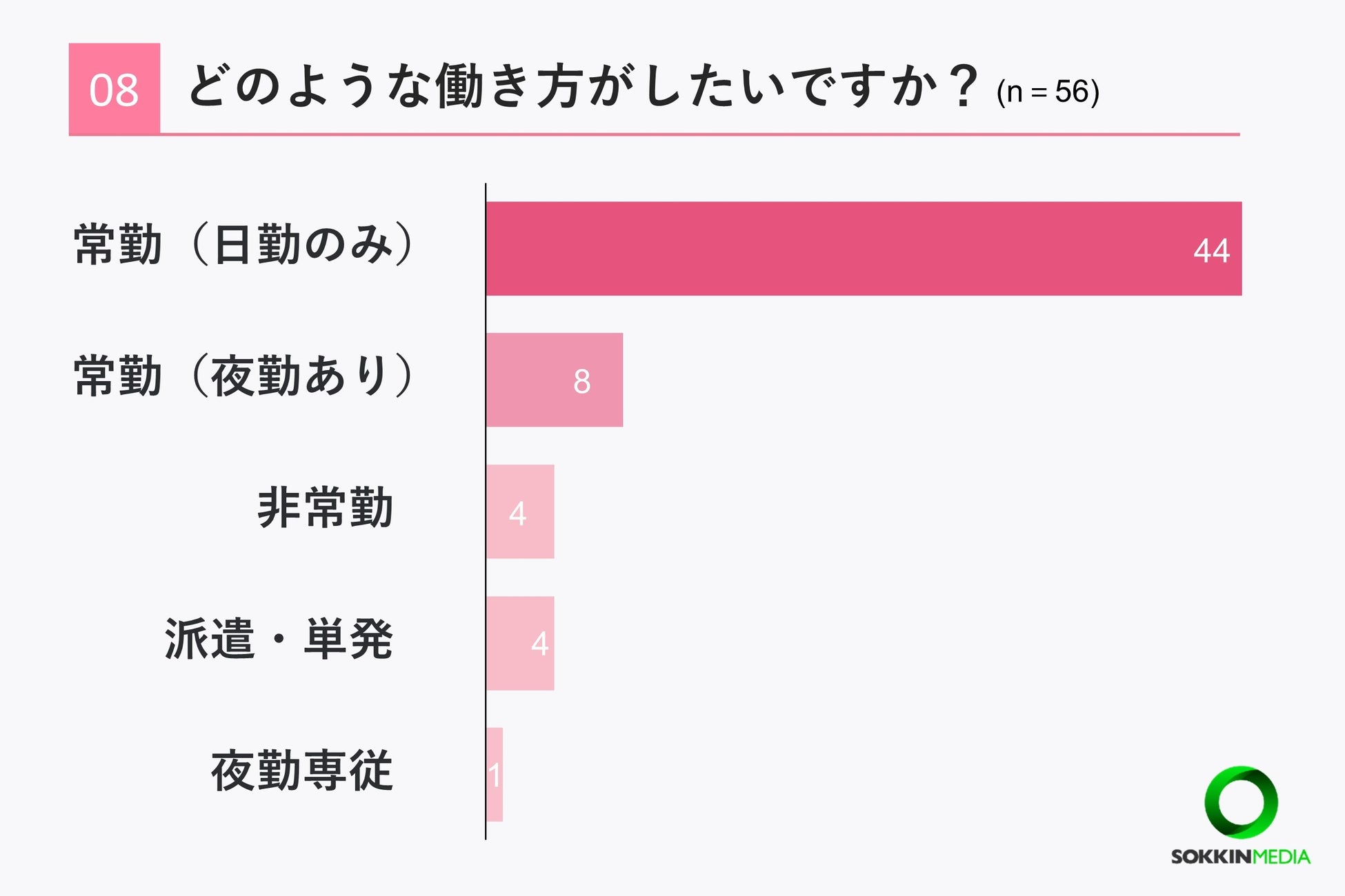 「Q8. どのような働き方がしたいですか?」という問いに対して、「常勤(日勤のみ)」という回答が44票と圧倒的に多く72%という結果になりました。