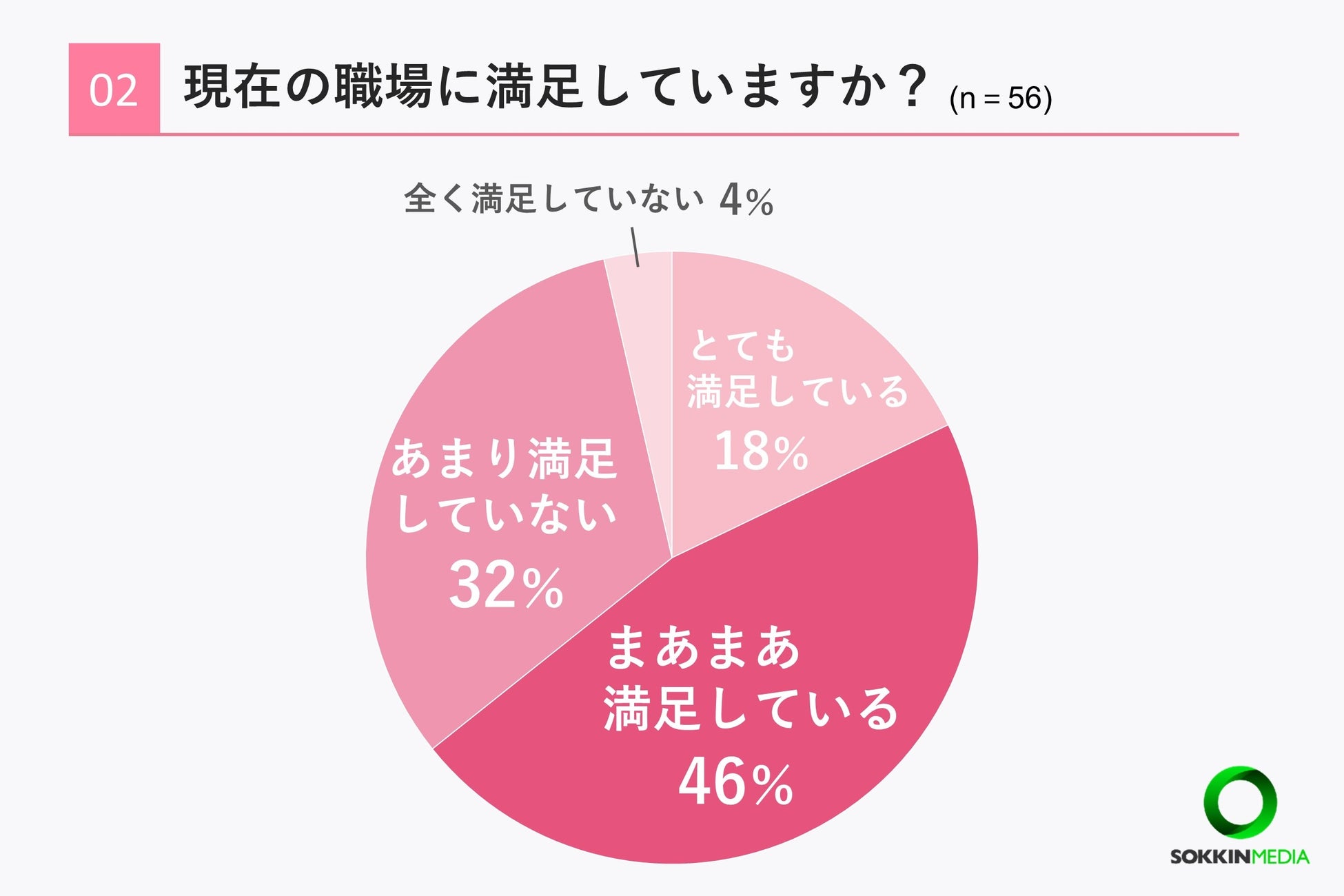 「Q2. 現在の職場に満足していますか? 」という問いに対して、「まあまあ満足している」が最も多く46%、次いで「あまり満足していない」が32%という結果になりました。