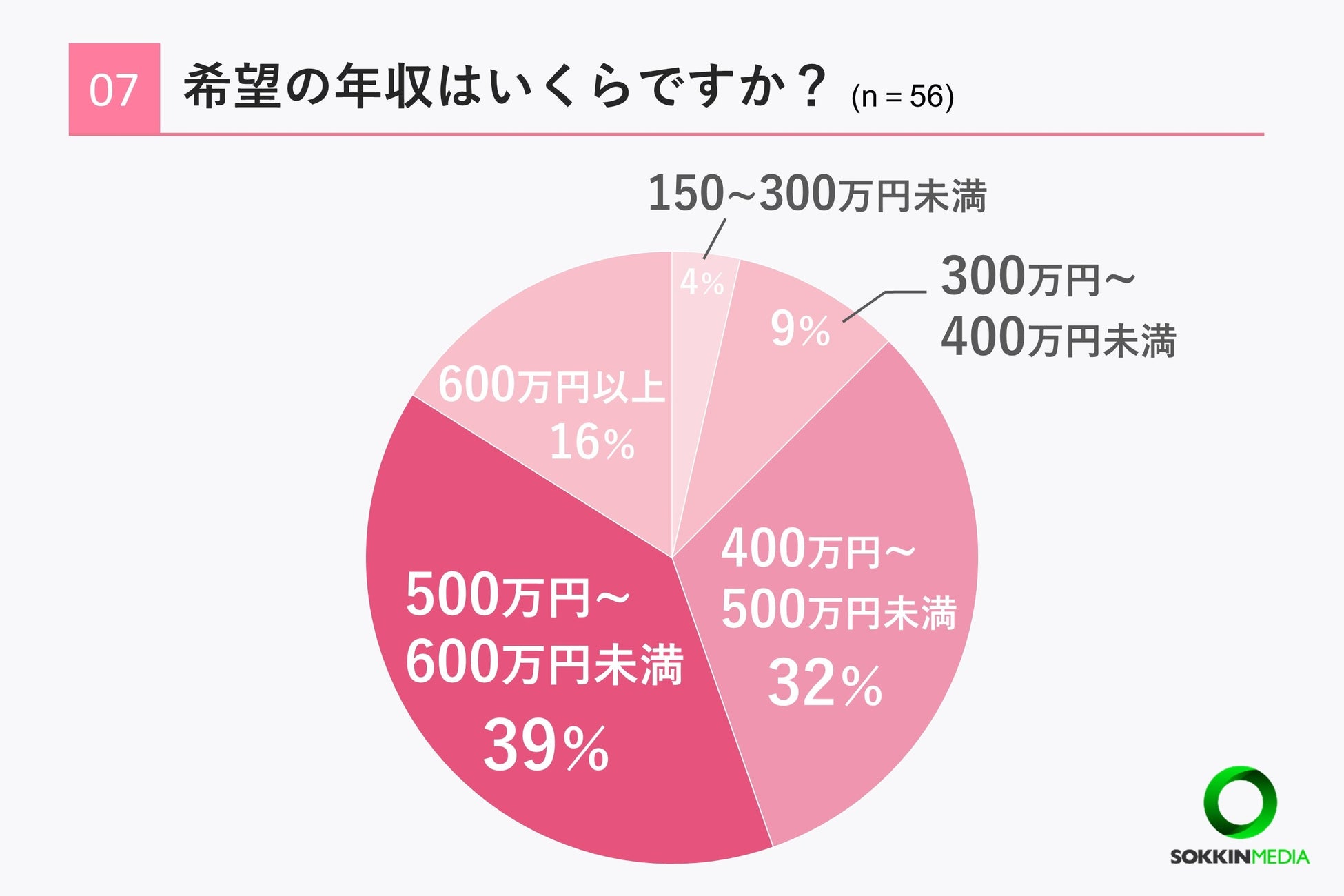 「Q7. 希望の年収はいくらですか?」という問いに対して、「500万円~600万円未満」が最も多く39%、次いで「400万円~500万円未満」という回答が32%という結果になりました。