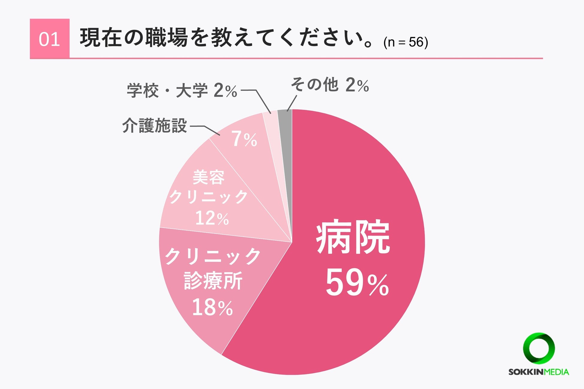 「Q1. 現在の職場を教えてください。」という問いに対して、「病院」という回答が59%、次いで「クリニック・診療」という回答が18%という結果になりました。その他「美容クリニック」や「介護施設」などの回答も多く見られました。