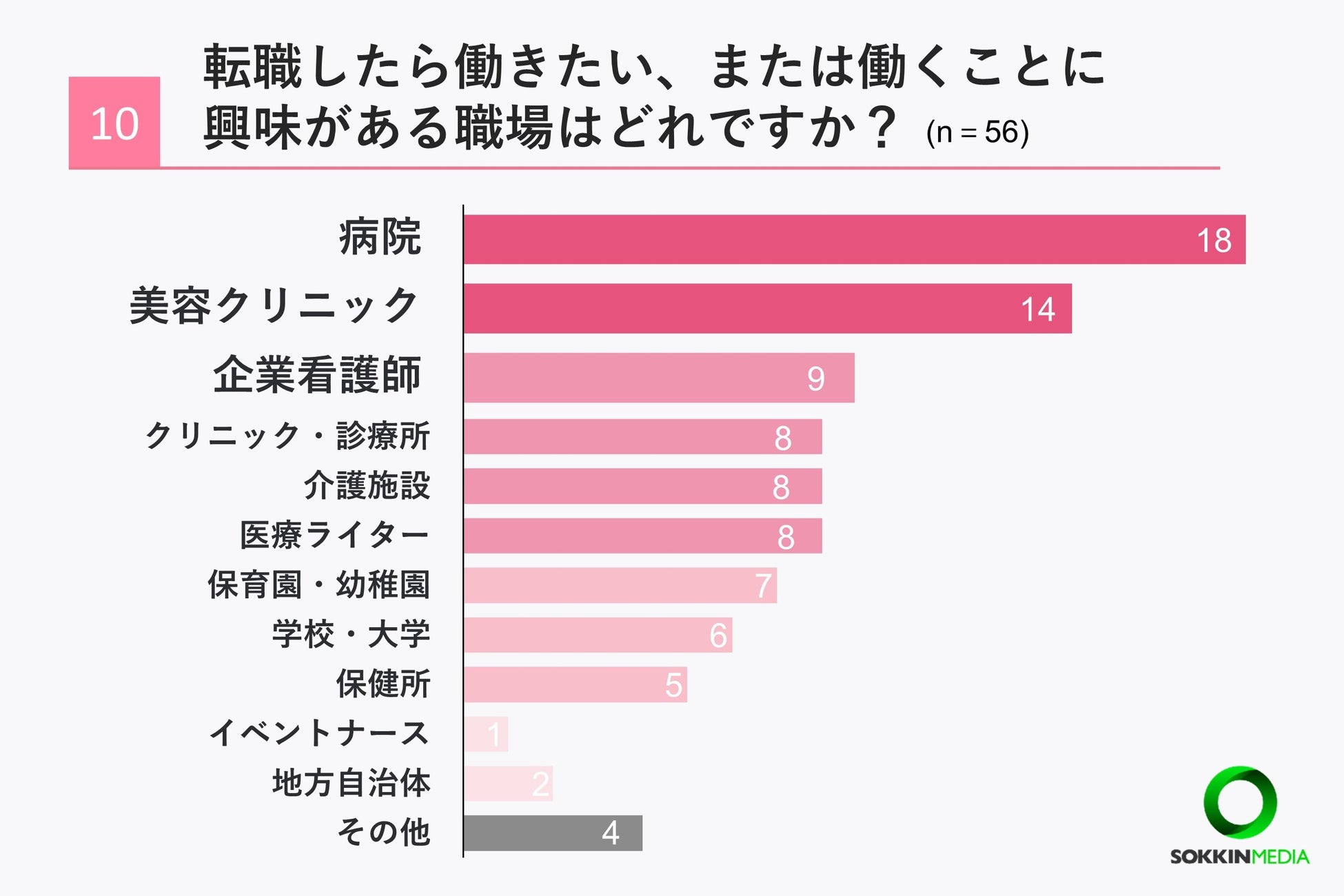 「Q10. 転職したら働きたい、または働くことに興味がある職場どれですか?」という問いに対して、「病院」が最も多く18票、次いで「美容クリニック」という回答が14票という結果になりました。