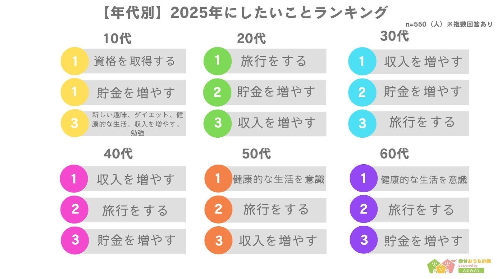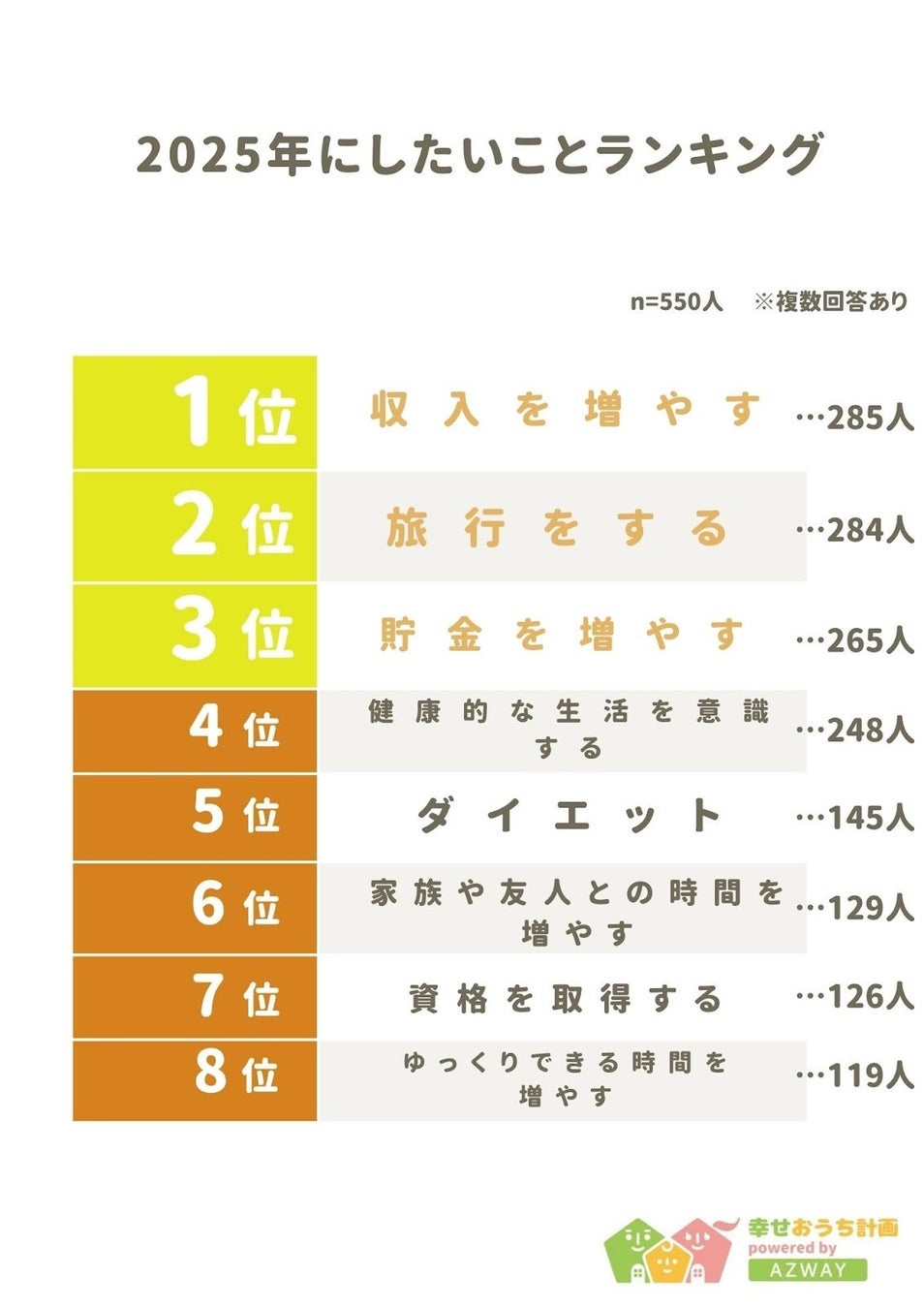 今回、株式会社AZWAY(https://azway.co.jp/)が運営する、幸せおうち計画(https://azway.co.jp/media/)は、10代から60代以上までの550人を対象に「2025年にしたいこと」についてアンケート調査を実施しました。