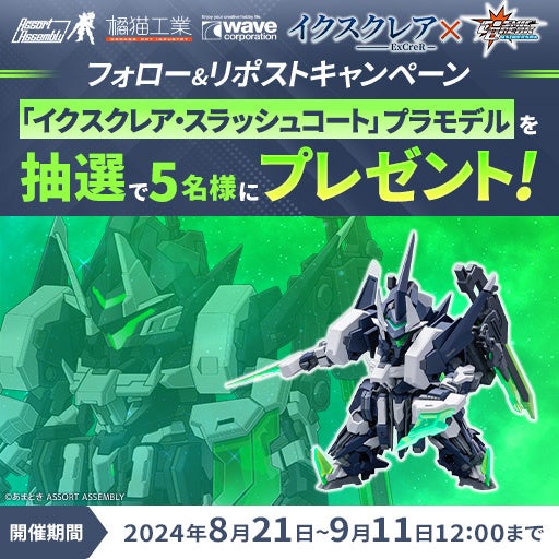 「イクスクレアコラボ第2弾」開催を記念して、2024年8月21日(水)より「イクスクレア・スラッシュコート」のプラスチックモデルキットをプレゼントするリポストキャンペーンを実施します。