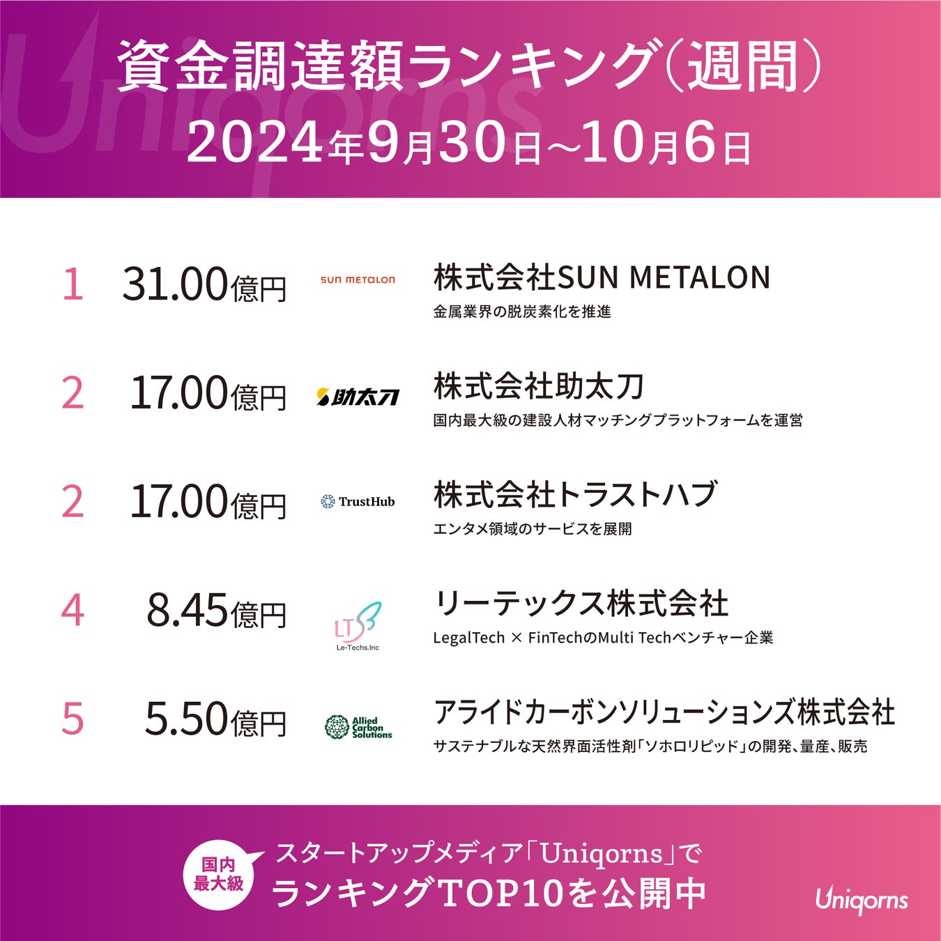 国内最大級のスタートアップメディア「Uniqorns(ユニコーンズ)」(運営:株式会社エモリューションクリエイティブ 本社:福岡市、代表取締役:松石 圭介)が発表した2024年9月30日〜10月6日の国内スタートアップ資金調達ランキングで、金属業界の脱炭素化を推進する株式会社SUN METALONが1位を獲得しました。同社はシリーズA 1stクローズにて31億円の資金調達を実施し、JICベンチャー・グロース・インベストメンツや住友商事グローバルメタルズなど、国内外の著名な投資家から支援を受けています。2位には、国内最大級の建設人材マッチングプラットフォームを運営する株式会社助太刀が17億円の資金調達で続き、パナソニック ホールディングス株式会社や日本郵政キャピタル株式会社などが出資しています。このランキングは、脱炭素化や人材マッチングなど、社会課題解決に取り組むスタートアップへの投資が活発化していることを示しています。