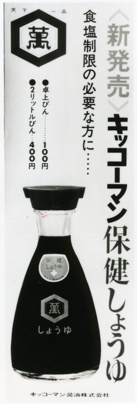 キッコーマンは、東京大学医学部の要請を受け、しょうゆ本来のうまみや風味は残しつつ、通常のしょうゆに比べて塩分を大幅にカットしたしょうゆを開発し、1965年に「保健しょうゆ」(1967年に「減塩しょうゆ」に商品名を変更)を発売しました。発売してからしばらくは病院の給食用として使われることがほとんどでしたが、健康意識の高まりとともに、1970年代後半からは広く一般のご家庭でも使われるようになりました。
