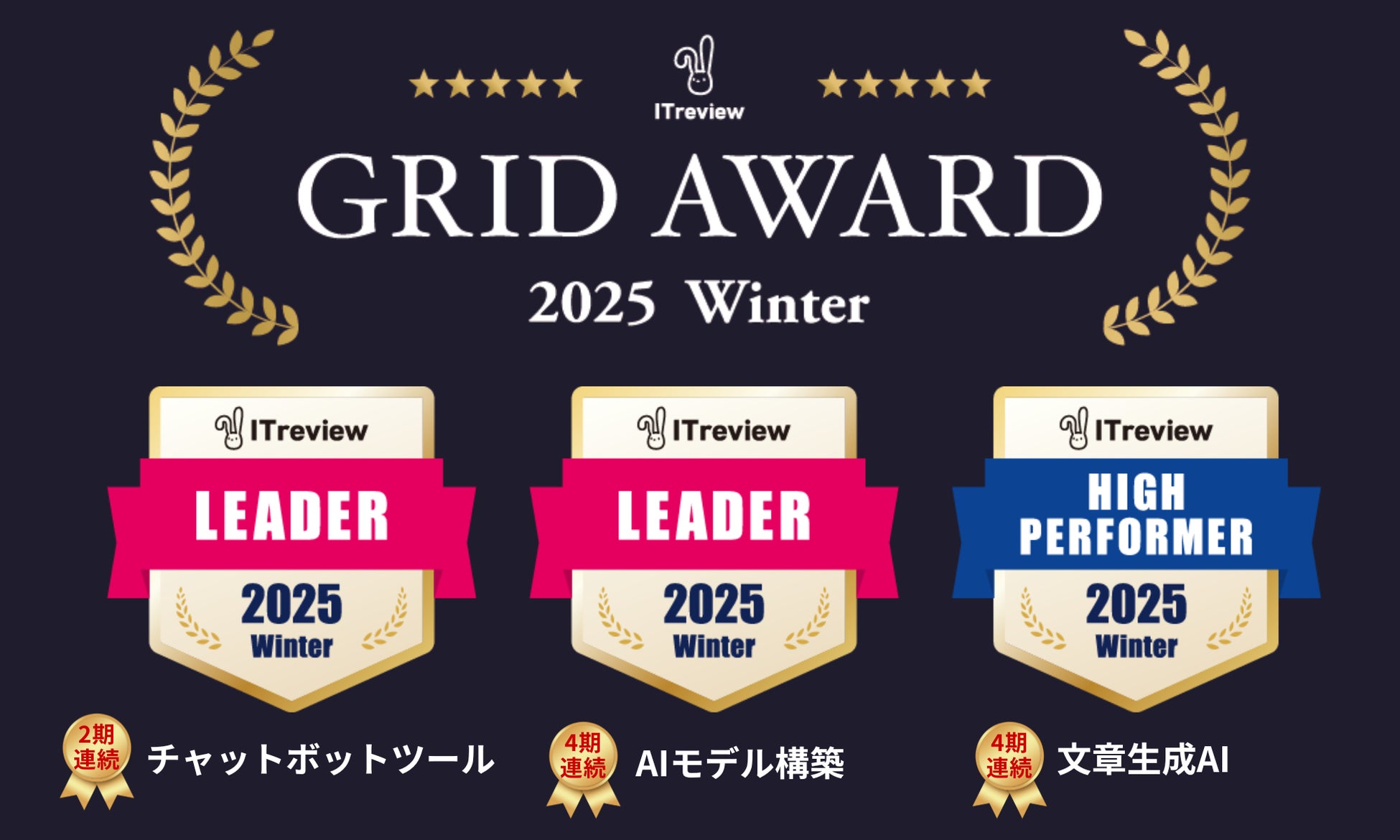 カサナレ株式会社(本社:東京都渋谷区、代表取締役:安田喬一)は、IT製品レビュープラットフォーム「ITreview」で発表された「ITreview Grid Award 2025 Winter」において、ユーザーから高い評価を受け、「AIモデル構築」部門で4期連続「Leader」受賞、「チャットボットツール」部門で2期連続「Leader」を受賞。さらに、「文章生成AI」部門で4期連続「High Performer」を受賞したことをお知らせいたします。