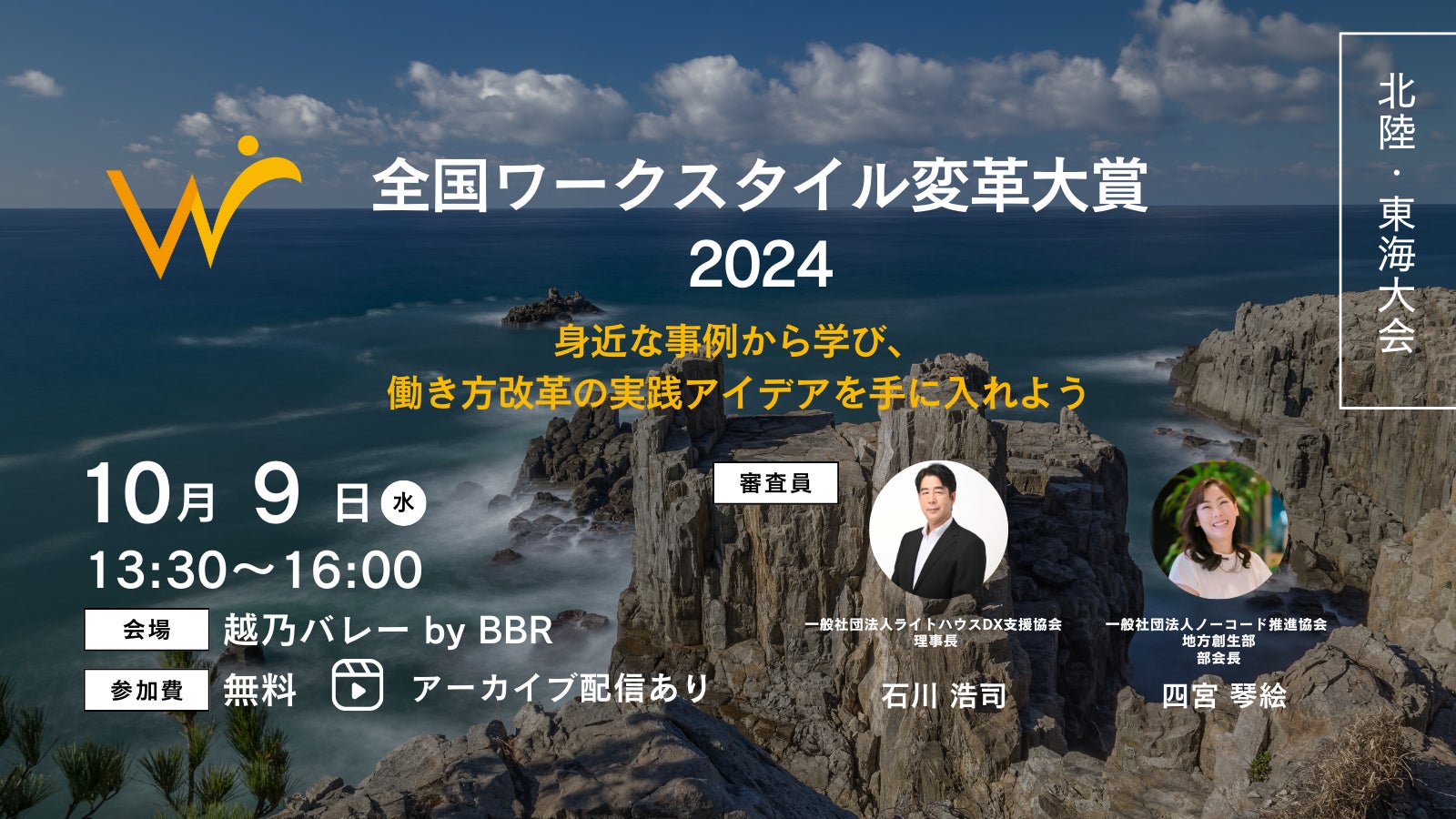 全国ワークスタイル変革大賞北陸・東海大会実行委員会は、2024年10月9日(水)、福井県福井市にて「全国ワークスタイル変革大賞2024 北陸・東海大会」を開催いたします。この大会では、地域特有の課題を乗り越えながらも働き方改革で成功を収めた企業の事例を紹介し、他の企業に実践的なアイデアを提供します。